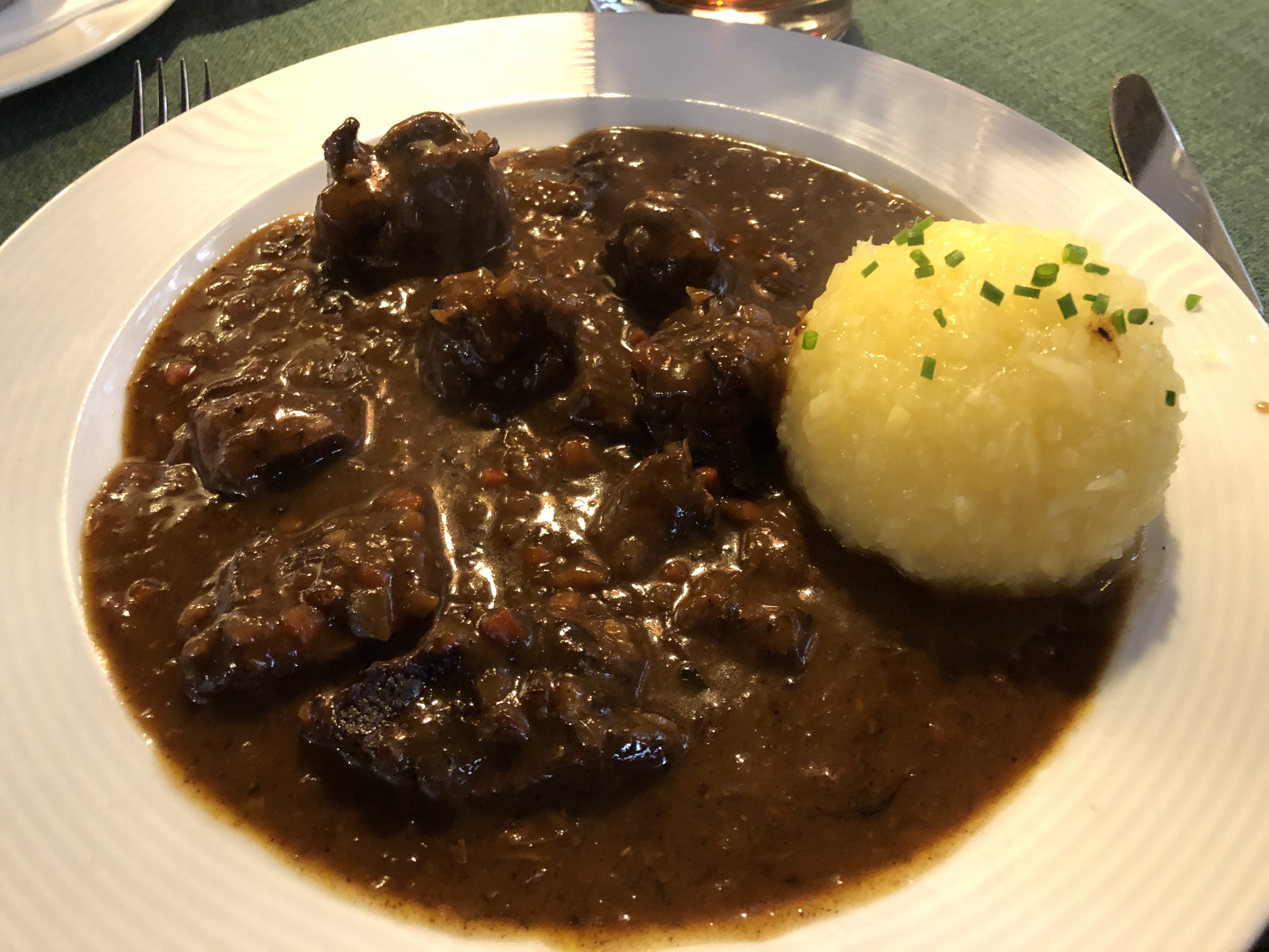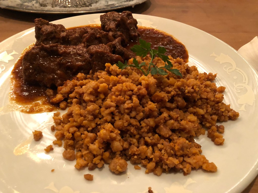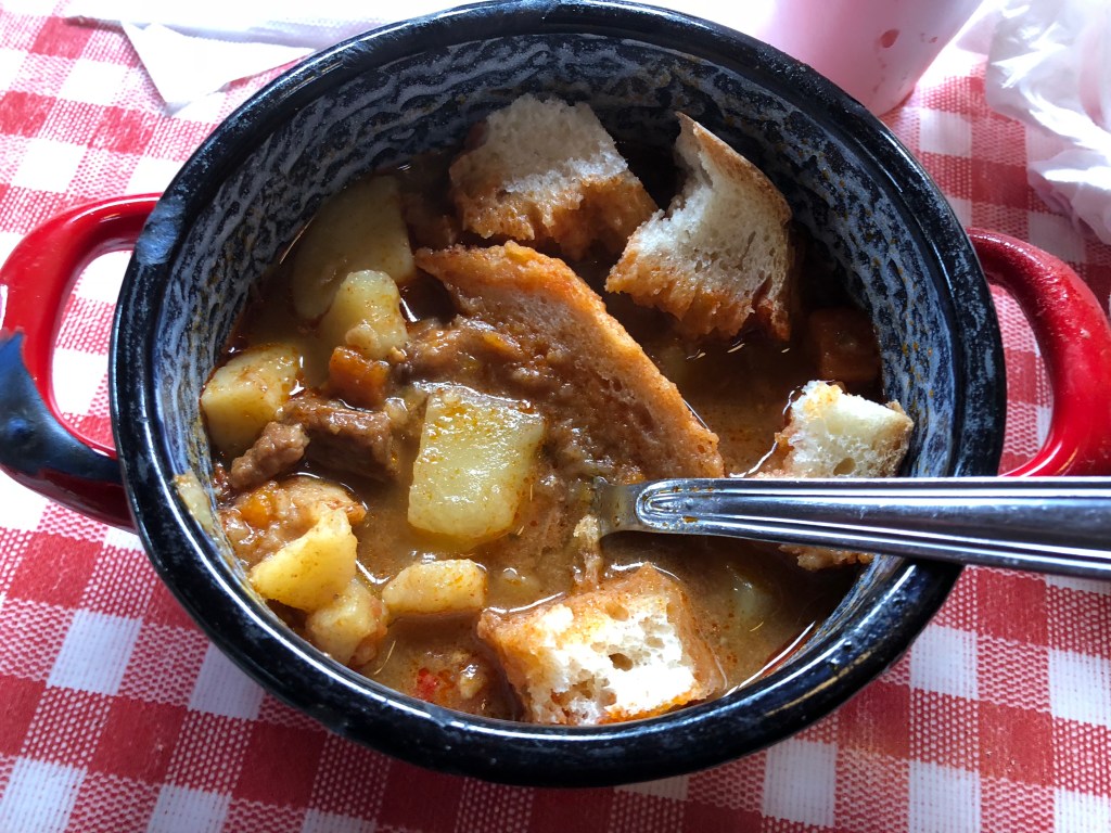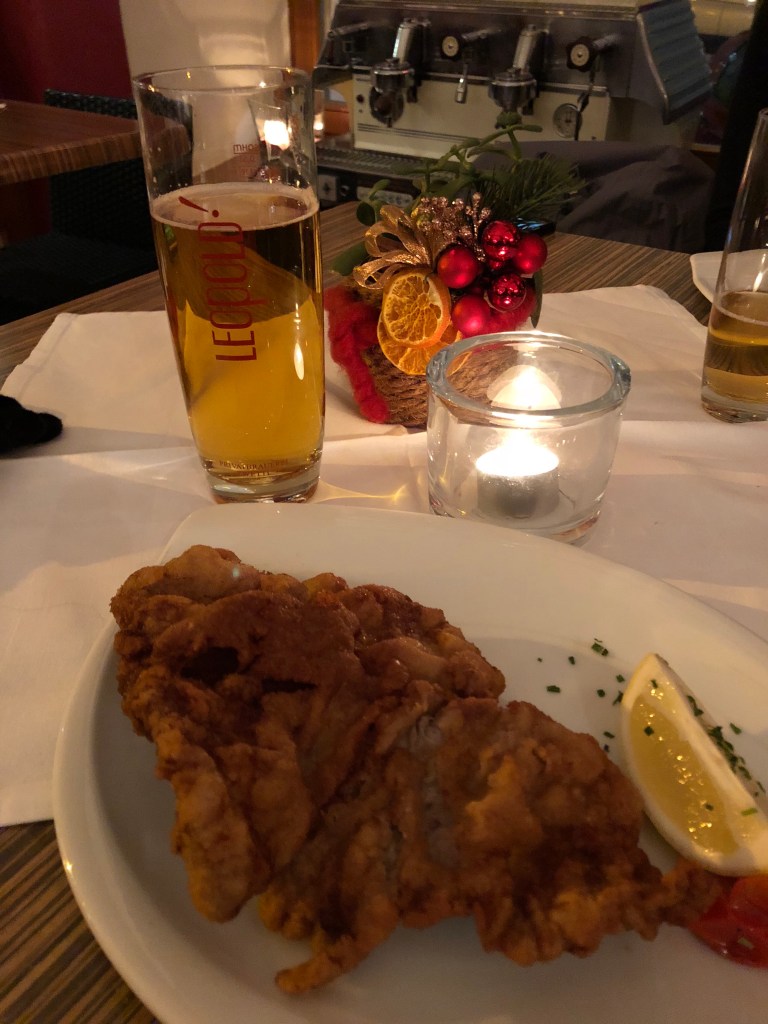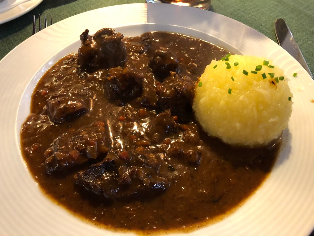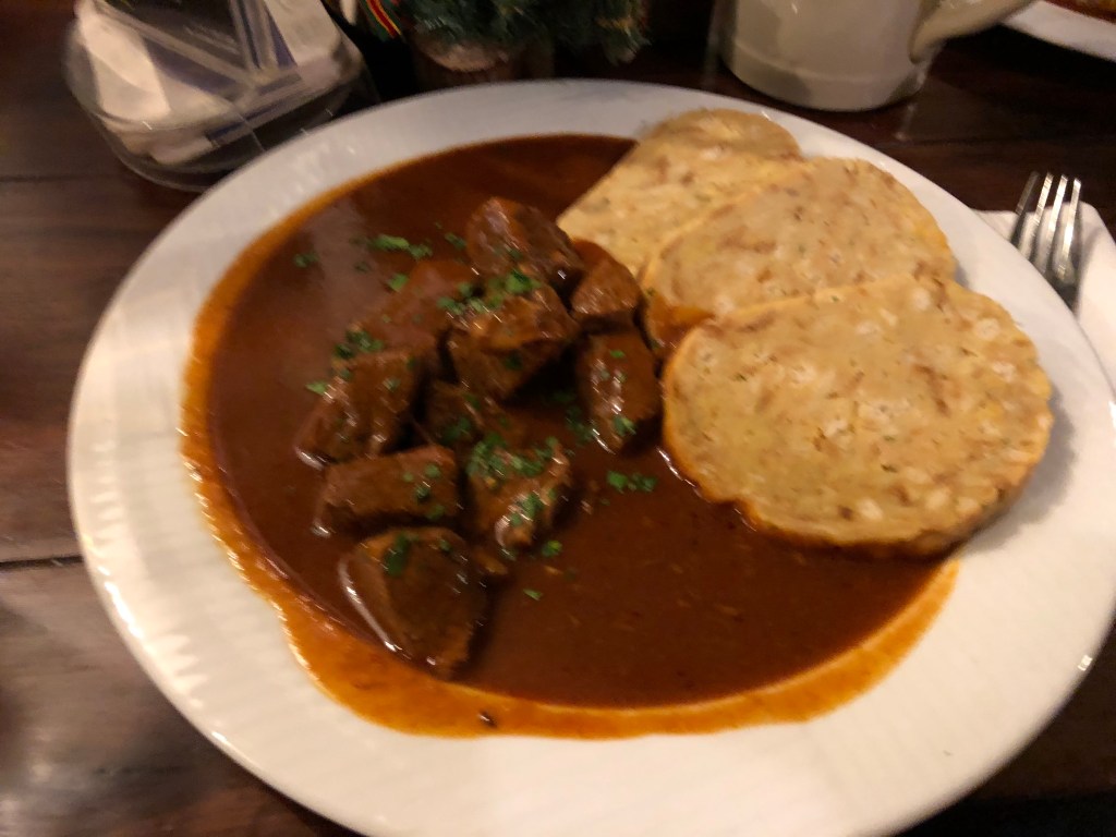 Let’s start with Vienna. Bordering Germany and Czechia to the north, the base of its cuisine is similar to both of those nations. It weighs heavily on grains and meat, especially pork and beef. However, Vienna has a couple specialties that feature prominently, and I tended to focus on those when we ate. First is schnitzel, which comes cheaper with pork and 30-40% more expensive with veal. The dish features a large slice of meat, between a centimeter and inch thick, that is encapsulated in a light fried dough. It comes with various accompaniments, including potatoes, parsley, lemon slices, and tart cranberries in the past. Any of the city’s wheat beers also pairs great with this dish. Vienna has a take on goulash as well, although it’s more of a stew and was, in my opinion, less flavorful than the Hungarian version.
