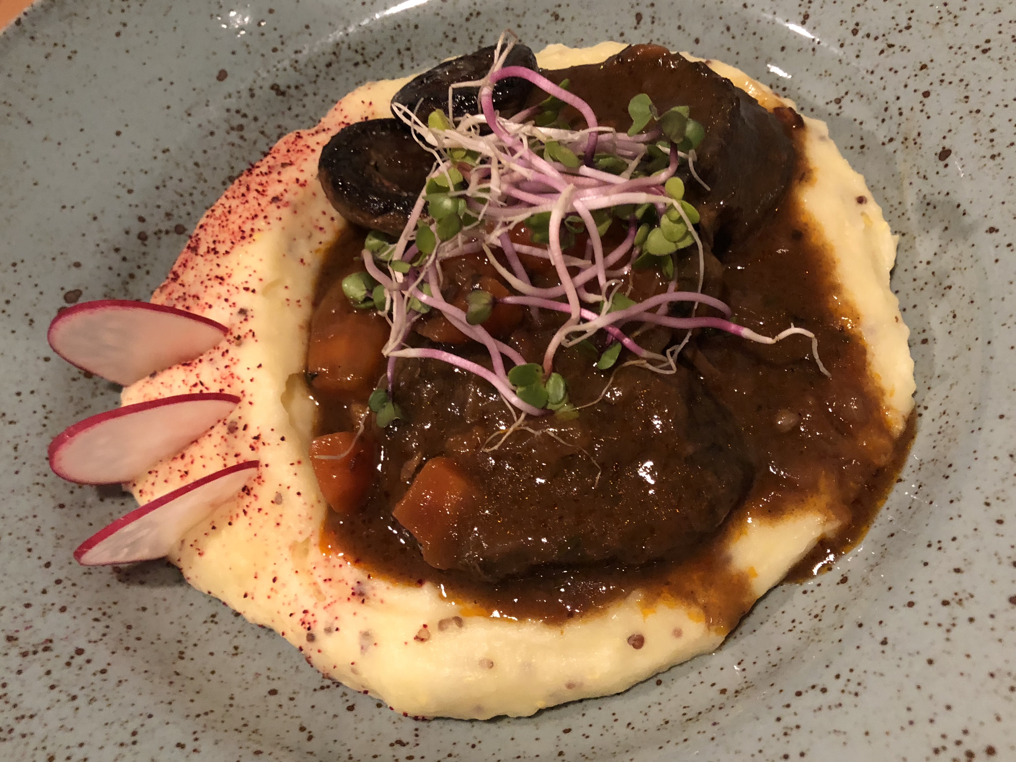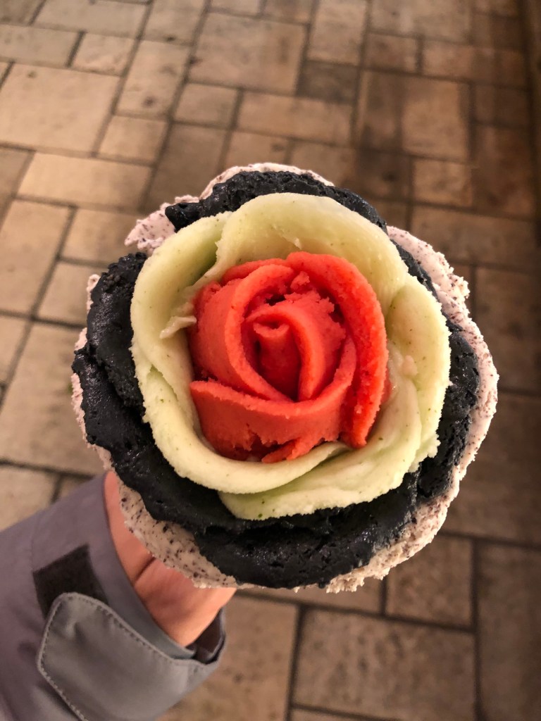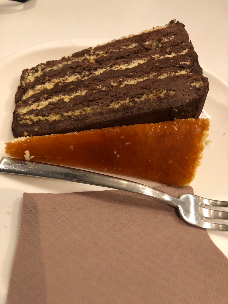 Next was Budapest, my personal favorite for food. The first thing to note is that Hungarians love their paprika. One year they had a bad harvest and declared a nationwide emergency and rationing as a result! This peppery spice manifests in several dishes, with the most common one probably being goulash (spelled gulyas in Hungary). Our first night in Budapest, we stopped in a restaurant called Getto Gulyas, a restaurant I stumbled across my last week of study abroad, but went to thrice in that last week. Contrary to most gulyas in Hungary which comes in soup form, they still serve it as a stew with doughy “dumplings” to the side. The best part of gulyas is the accompanying sauce, which is rich and flavorful, and is soaked up well by bread or other grains. We also got bone marrow, which came topped with garlic. Meat and grains still form the foundation of the diet here though, and my study abroad program actually warned that Budapest would be harder on vegans than most cities. Anyway, Budapest joins Vienna in being pastry-proficient, even though they aren’t as well known for it. Our only stop for sweets this trip was Socks Cafe, the one I used to work for hours at. Back then I’d eventually cycled all the way through their menu, although this time I just got their Sacher torte. I also got their cherry coffee, which would’ve been a splurge for me during study abroad but was a drop in the bucket now. Lastly, my favorite gelato shop should be familiar to anyone who loves the chain Amorino and their rose-shaped ice cream creations. It’s Gelato Rosa just south of the St. Istvan cathedral, which is my favorite for their creative flavors of basil lime, strawberry elderflower, and lavender white chocolate. This was my most special treat during study abroad, and I went there to commemorate events like my first half marathon, 21st birthday, and the day my Microsoft housing stipend hit my savings account! They’d added black sesame to their roster this time, and I went twice this trip despite the freezing weather. I still haven’t experienced anything like the freshness of their fruity flavors anywhere else in the world.