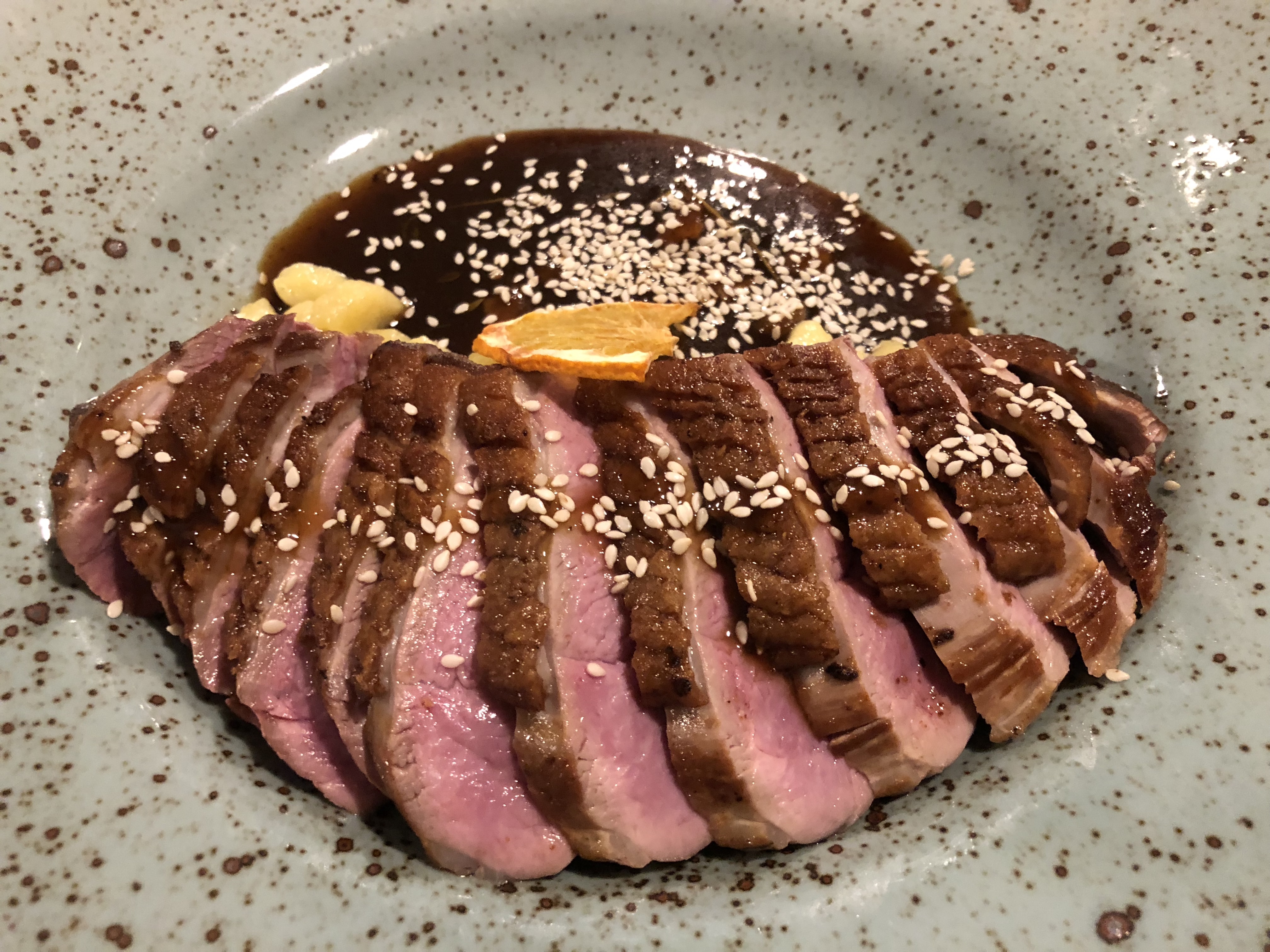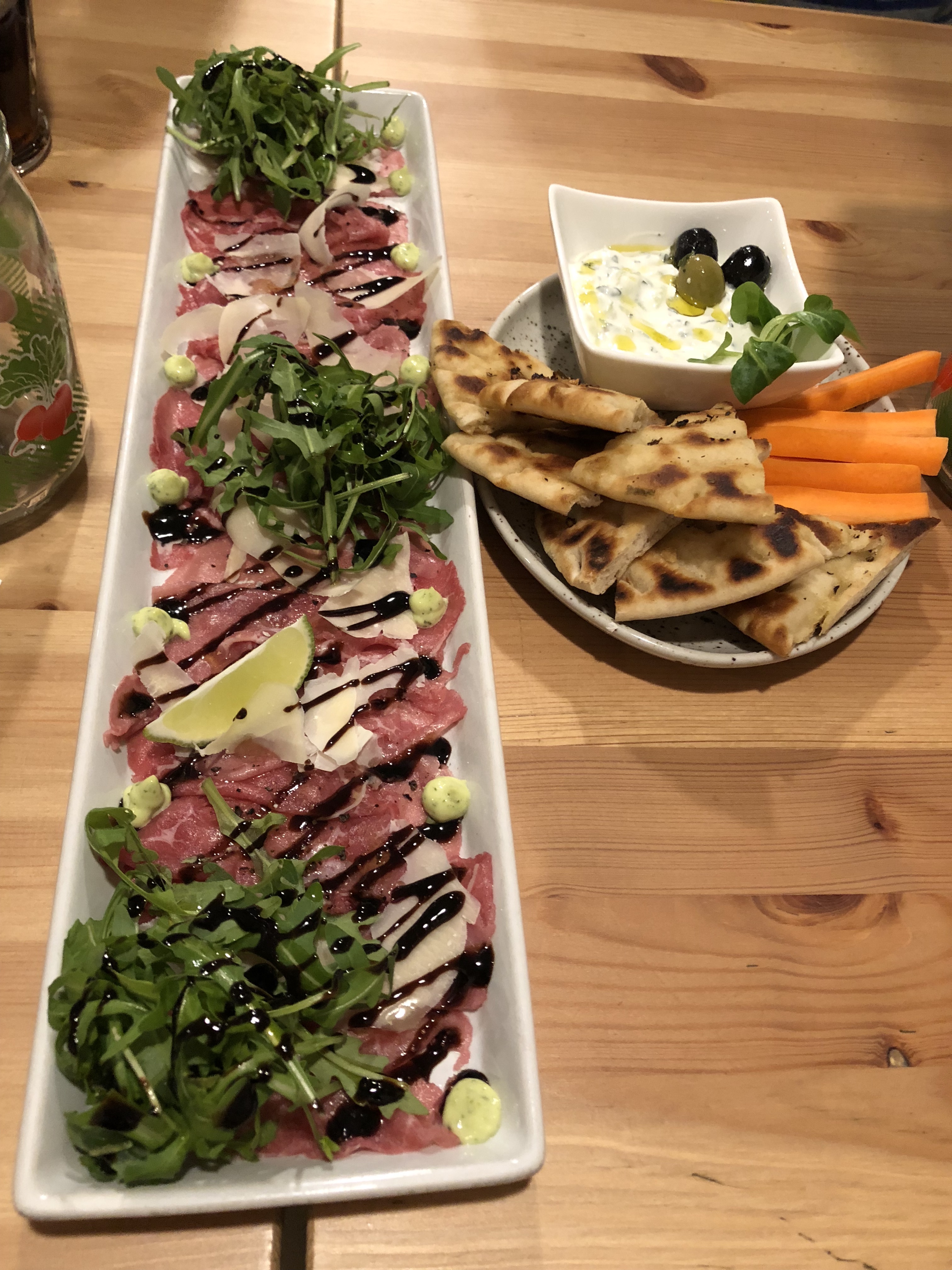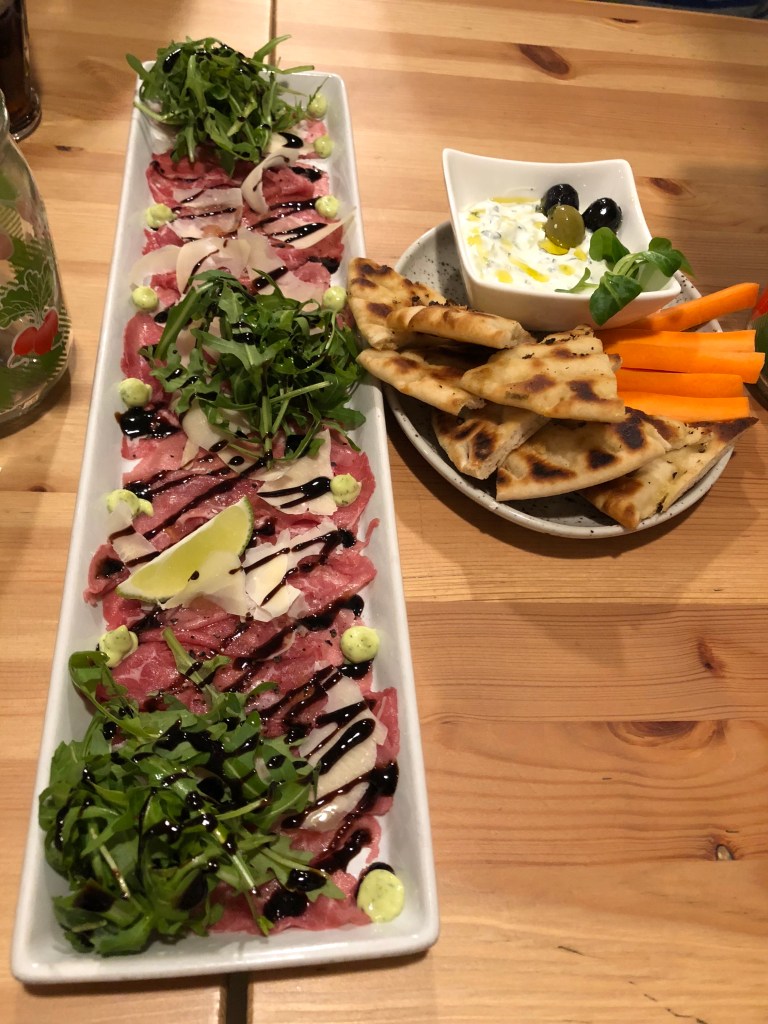 Next was Prague, which was probably the highlight of our trip both in terms of variety and quality of our food. We actually started off with our favorite dinner of the trip, at a restaurant our Uber driver recommended that was a block from our AirBnB. We never would’ve found it otherwise, since it wasn’t even listed in Yelp by my memory. We started with a bowl of pita bread and tzatziki sauce, along with a plate of prosciutto and arugula. After mostly meat in our first two cities, we were glad to finally see more vegetables. The rest of their dishes were meat-based, but more creative and flavorful than the schnitzels and gulyas we’d had so far. Particularly good were the thick slices of duck that came with a rich orange sauce.