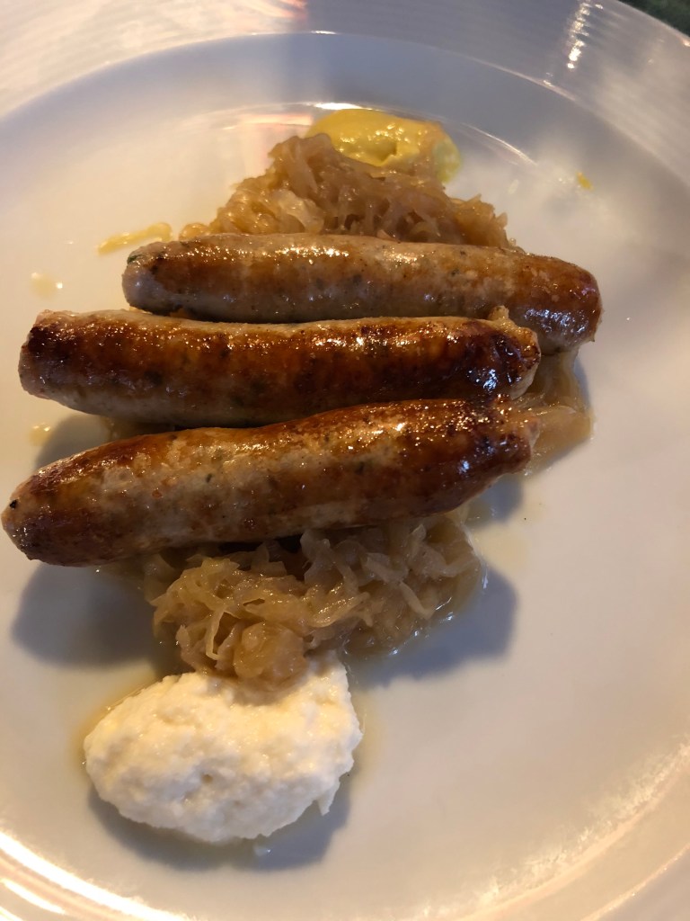 Last, and honestly least, was our visit to Nuremberg in Germany. We were all pretty ready to go home at this point, but I found the food here to be underwhelming. Our first night, we arrived late enough that we just grabbed sausages at the Christmas market, which were hearty and did the trick. The next day, we made lunch reservations at the Albrecht Durer house restaurant. We were served the most stereotypical German food I could’ve imagined. We got sausages and sauerkraut, a heap of beef stew and starch, and a massive steaming bowl of purple cabbage. Seriously, that cabbage could’ve been a meal on its own and I still don’t think I could’ve finished it! The food was good and I finished most of my main, although I barely touched the “side” of cabbage. It was just completely lacking in variety. Also in true German fashion, I ordered a litre of dopplebock (that was the smallest size they had) to down it all. Beer was cheap, delicious, and came in large sizes for every stop of this trip. We probably each drank 5 litres or more by the time it was over. Anyway, dinner that night proved to be sausages once again, adding to my enthusiasm that we would finally be headed home.