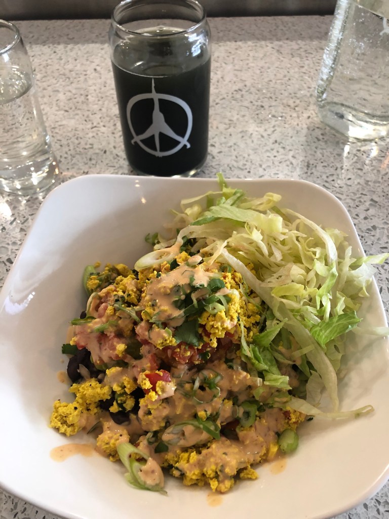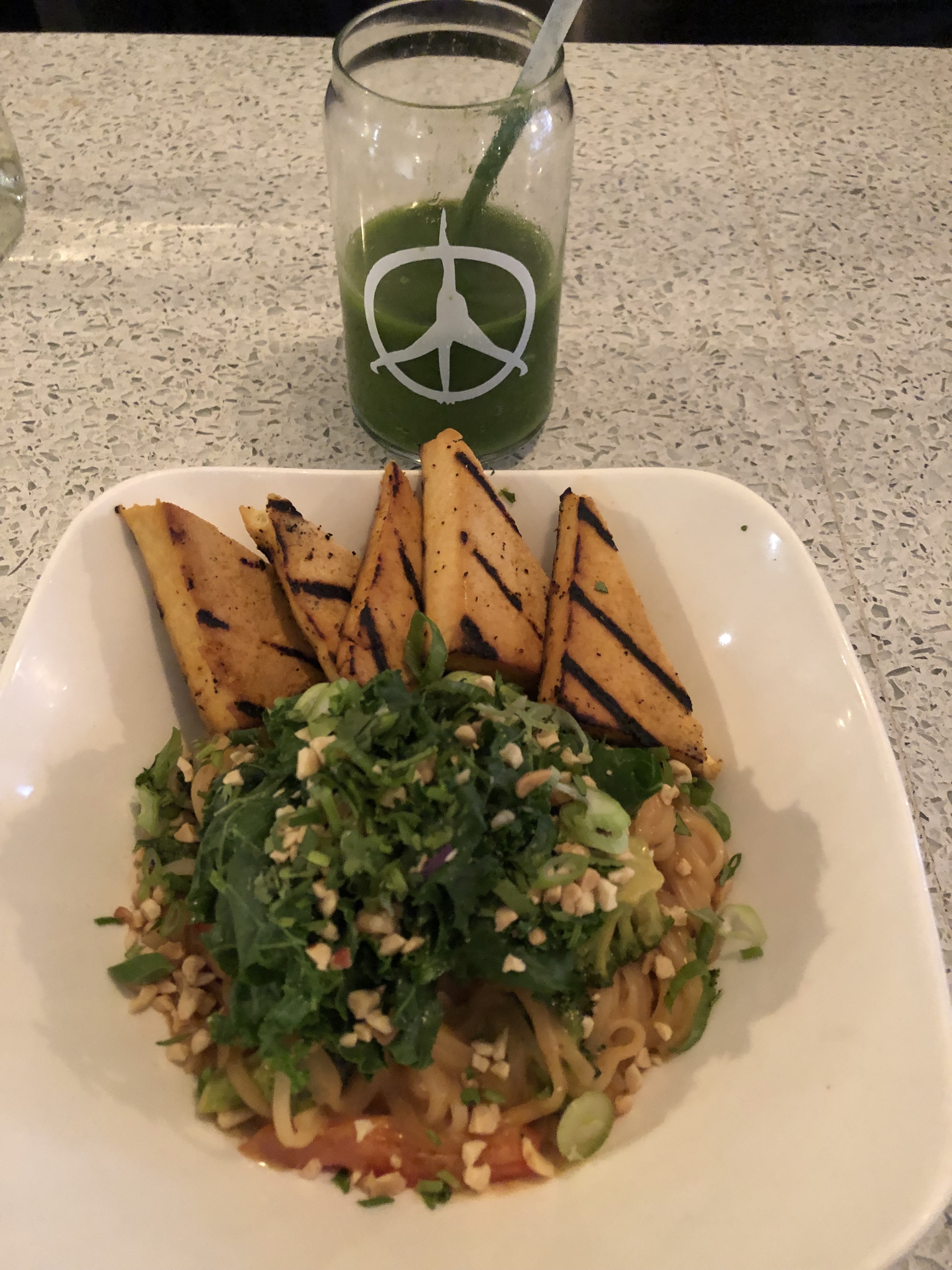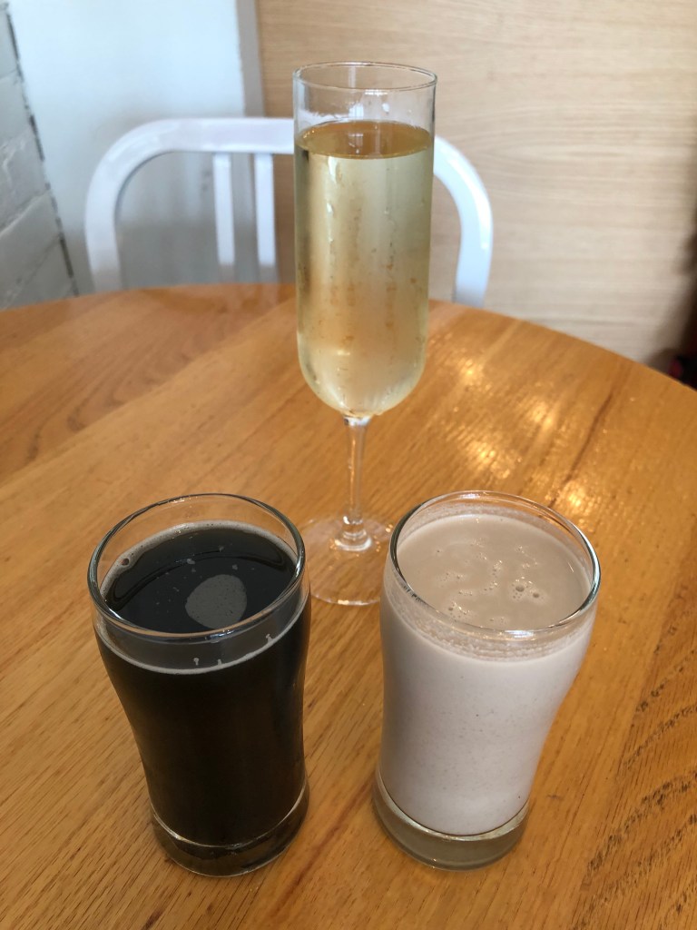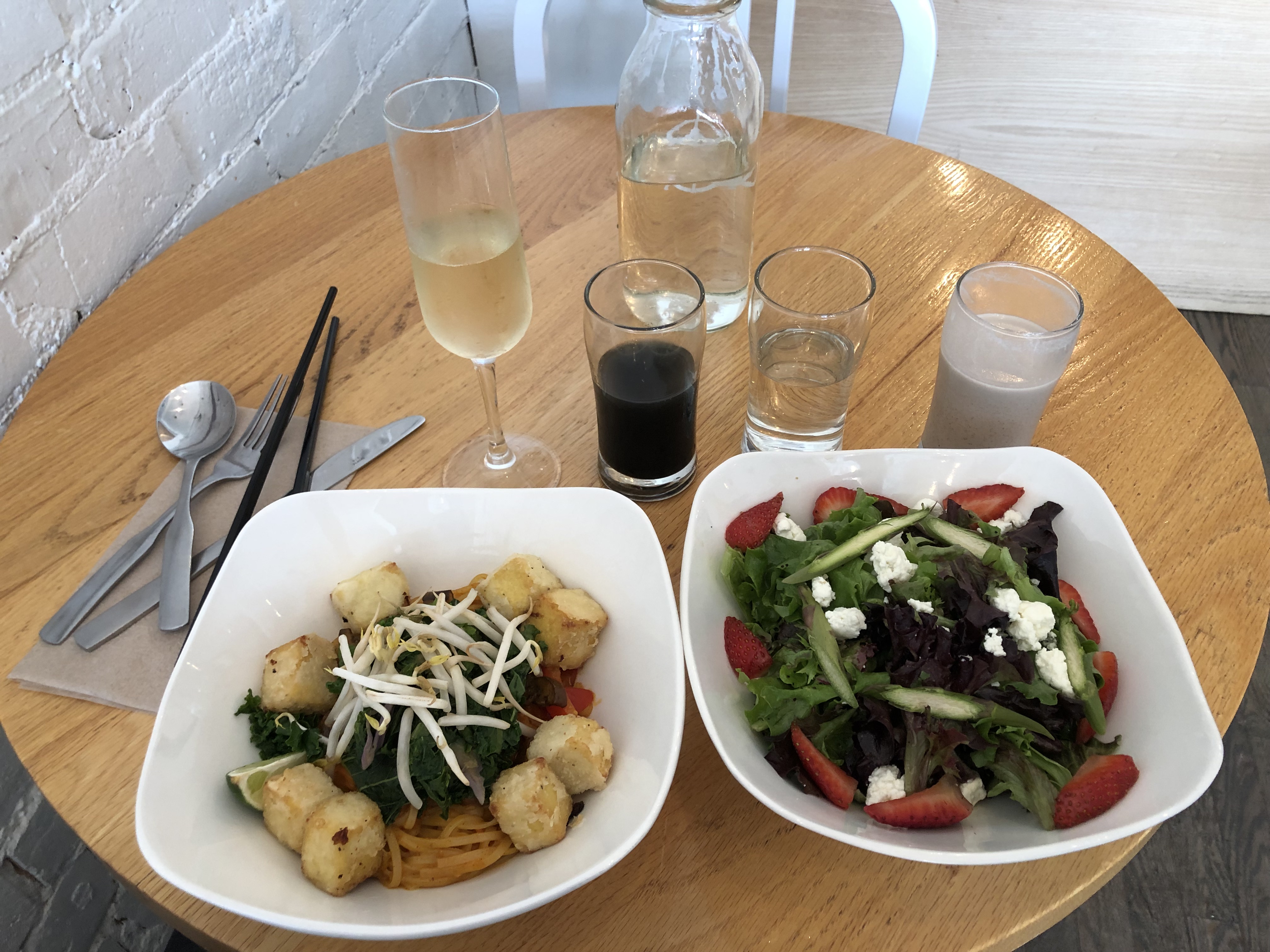 My last meal there was a second in a row. I took a 90 minute nap at my AirBnB after the marathon, and didn’t want to walk far for food after waking up. Pure Kitchen was perfect, and I decided to go all-out with my order. I had a glass of sparkling Cava to celebrate my race, as well as my now-favourite bamboo juice and another date-based one. I got spicy noodles with tofu, as well as a strawberry asparagus salad to earn back some of the calories I had lost. For healthy options, I’d absolutely go back here. I even got a couple bottles of juice to go for my last day.