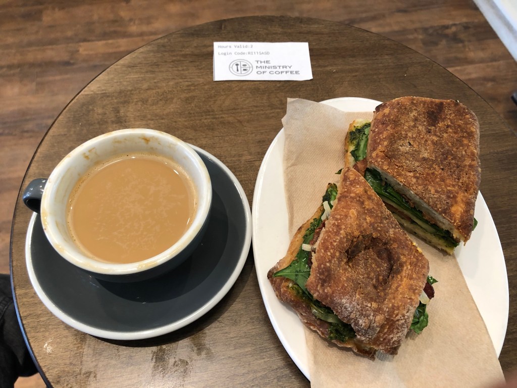 My first day was a Friday that I spent working. I did part of it in my AirBnB, but the rest of the afternoon I spent in the Ministry of Coffee for a late lunch. It was a comfortable place to work, and the coffee was much-needed after taking 3 hours to fall asleep the previous night. The sandwich was a warm panini with pesto and sundried tomatoes, and hit the spot even though the bread scratches the roof of your mouth like most paninis. Three days later, I took scones at the Scone Witch, a filling treat with deliciously sweet blackberry jam. I also had a ham and guyere cheese scone, which kept me full ‘til lunch. I had time after that for a flat white at Equator coffee, a local transplant from my hometown which was a nice, familiar brew.
