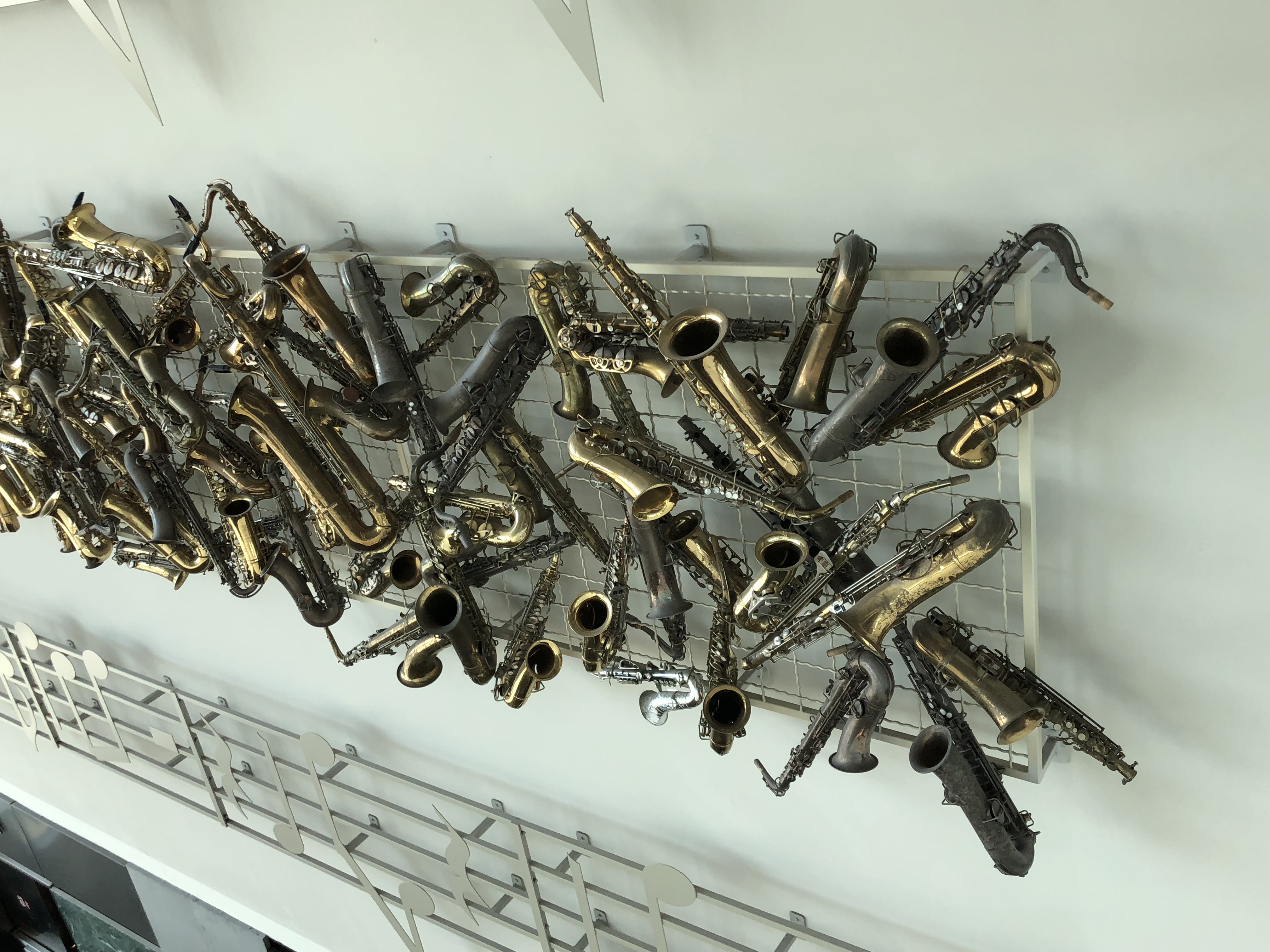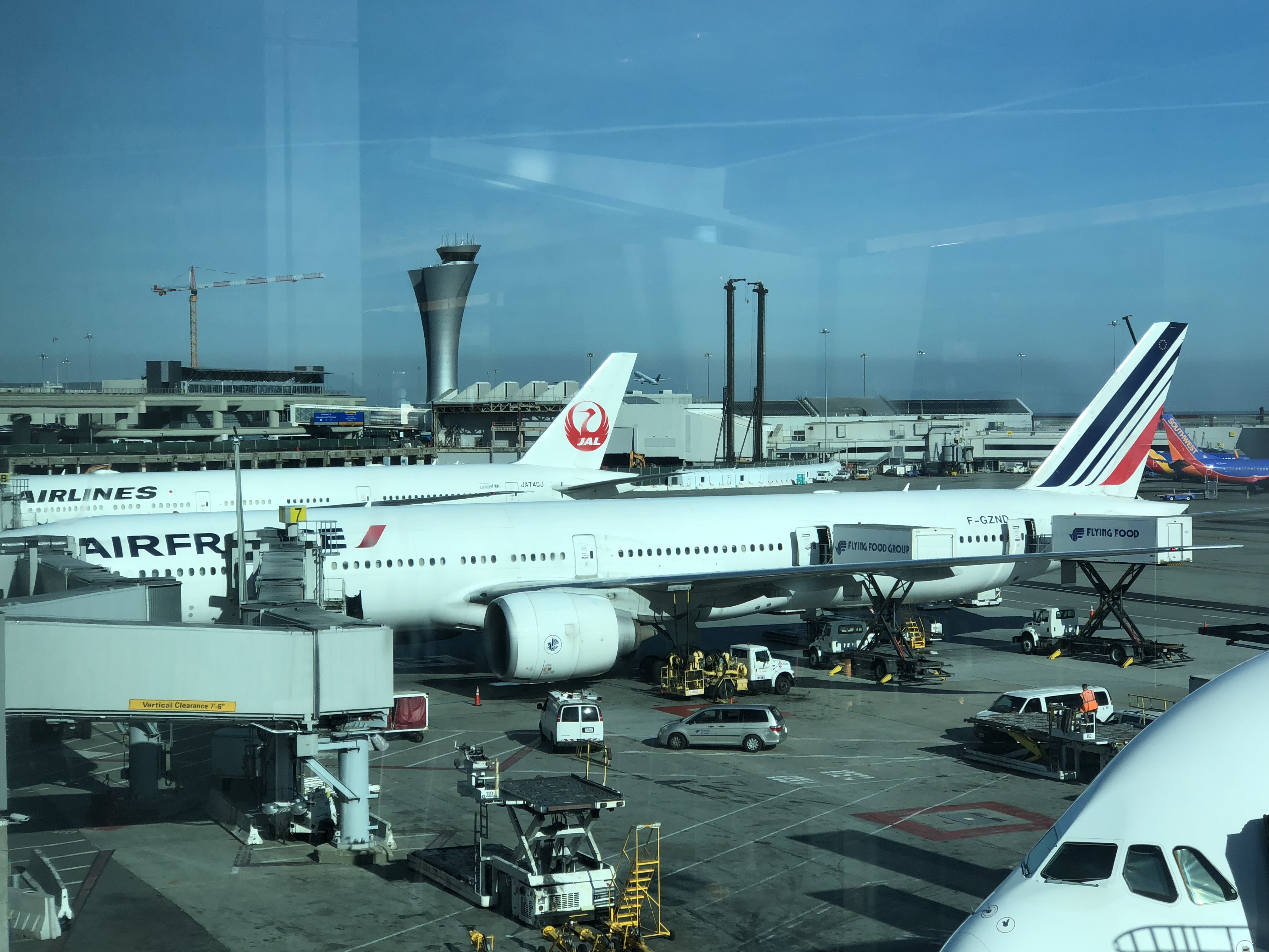 Checking our bags went smoothly, and soon enough we were through security as well. While my friends decided to wait near the gate area, I burned the remaining time before boarding by wandering through the terminal and taking photos of the planes and terminal artwork. First I spotted our KLM plane, nicknamed the Flying Dutchman. I thought that was a nice touch, although upon landing in Amsterdam I learned that all of their planes have that name… Next was also the Qantas 747 that flies to Sydney, which they’ve sadly but understandably retired now. Lastly was a side-by-side of Air France and Japan Airlines 777-300ERs. We could have flown Air France to Vienna instead, but their 1 hour layover didn’t leave much room for delays, and there’s always the risk of your flight being cancelled by their strike-happy workforce. To this day I still haven’t flown them, partially for that reason. SFO also hangs up a few large art installations in this terminal. I appreciated the saxophone cacophony in particular because I used to play that instrument in my high school’s marching band.