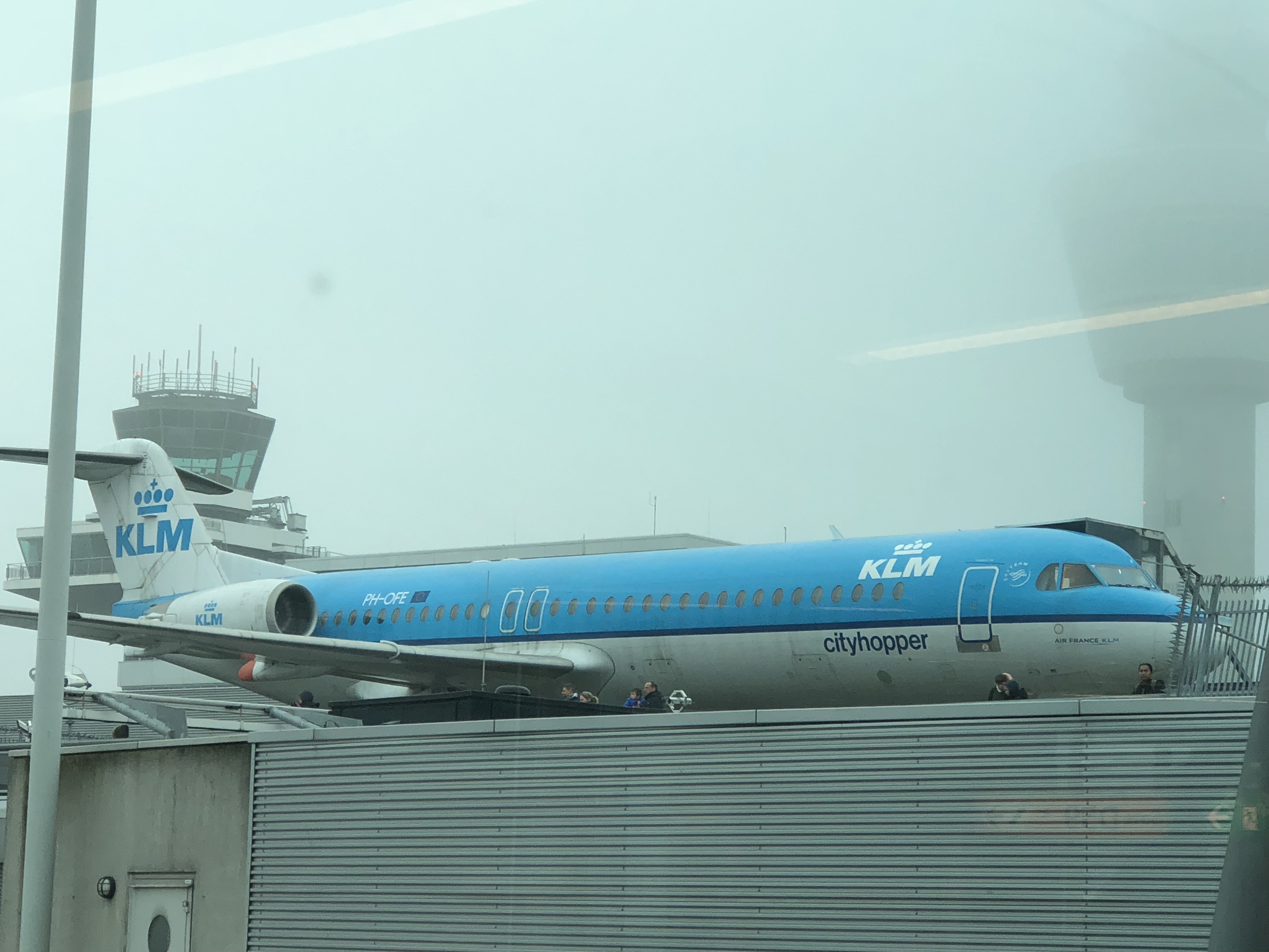 Because I don’t make an effort to board economy class early enough to snap empty cabin photos, and the meals weren’t remarkable enough to be photographed, I sadly don’t have any photos of the flight itself. I do have a couple of things to note, however. KLM’s 777’s have 10-across seating, meaning that the middle of rows will have 4 seats instead of the 3 found on their 787s. For the lowest tiers of economy fares, you have the option of paying to reserve a seat at the time of booking. However, when you check in up to 48 hours before flying, you can assign yourself a seat then if you haven’t already. While families might still find it worthwhile to purchase seats together beforehand, I didn’t care about sitting beside my friends and was able to snag an aisle seat near the back of the plane, in a row that currently had an empty middle seat. I choose the back of the plane because passengers who still don’t assign themselves seats are assigned the remaining seats, usually middle ones, front to back. So sitting in the back of the aircraft will maximize your chances of scoring an empty seat next to you, with the only real cost being that it takes you around 5 more minutes to deplane than the front of economy class. Our flight was delayed leaving the gate for around an hour, for a reason I don’t remember. And we used the shorter east-facing runway for takeoff, which surprised me since it’s shorter and longhaul aircraft almost always use SFO’s longer northwest runway. Even from the west coast I have trouble falling asleep on early transatlantic departures, and I remember watching The Circle and a couple other films between resting my eyes. Time passed quickly enough and we landed around 10 a.m. the next day in Amsterdam, in fog so heavy that I couldn’t even see the runway outside until we touched down.