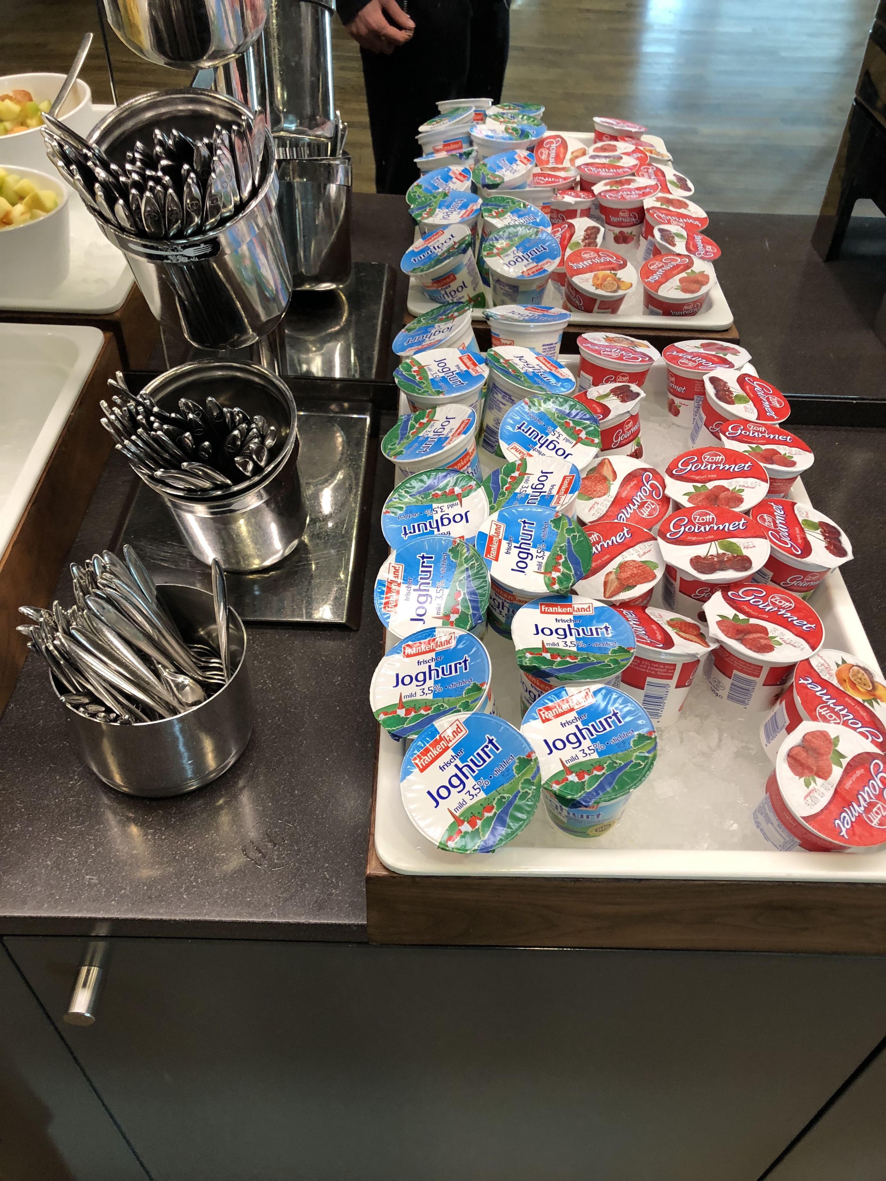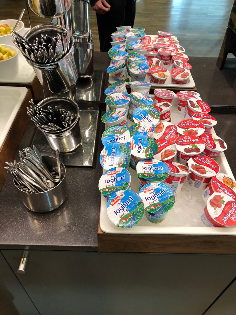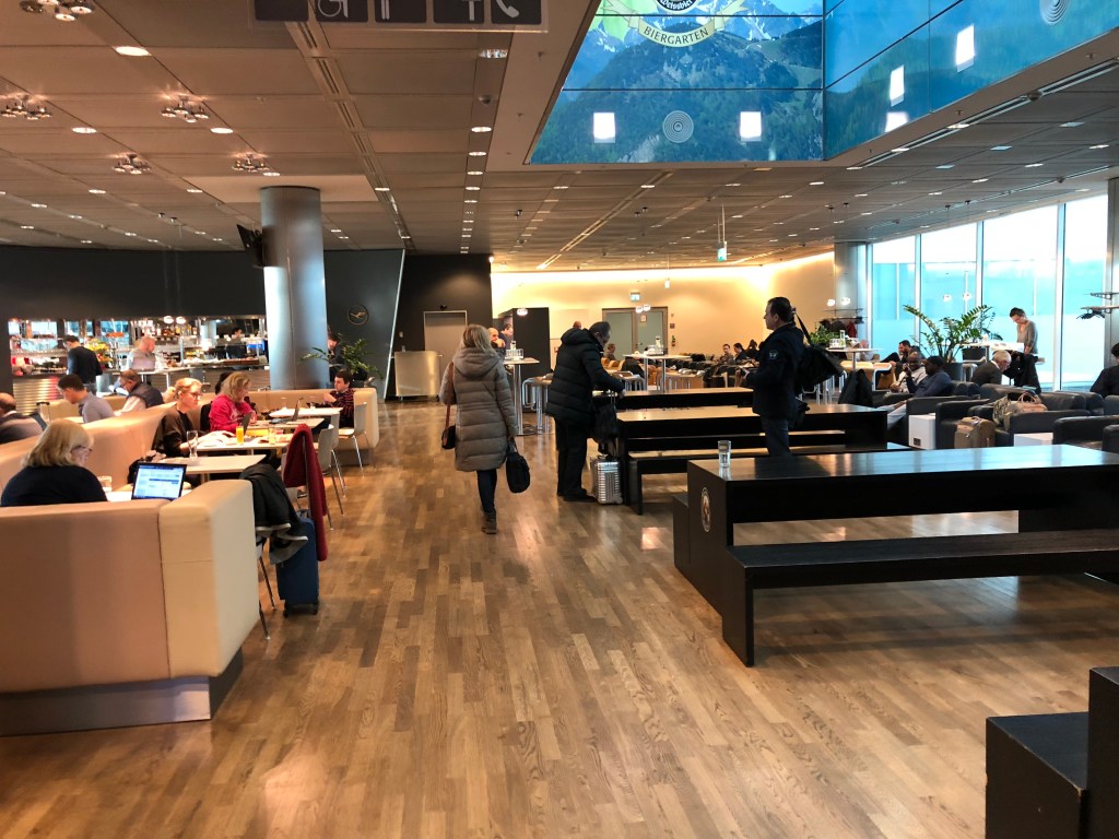 Anyway, I arrived at Munich airport around 8:30 a.m. this morning with my friends, on an early-morning bus from Nuremburg. This got me in 90 minutes before my flight, and it would have gotten my friends in 90 minutes before their Delta flight to Atlanta if it hadn’t been delayed by over 5 hours. I was left to bid my friends goodbye and walked over to the Lufthansa check-in counters. They were quick and efficient checking me in, which I appreciated since I didn’t leave myself a ton of time. Since my first flight was to Frankfurt, I had access to the Schengen-area lounge in Munich. It was upstairs soon after security, and I appreciated that it didn’t take a long walk to get there.