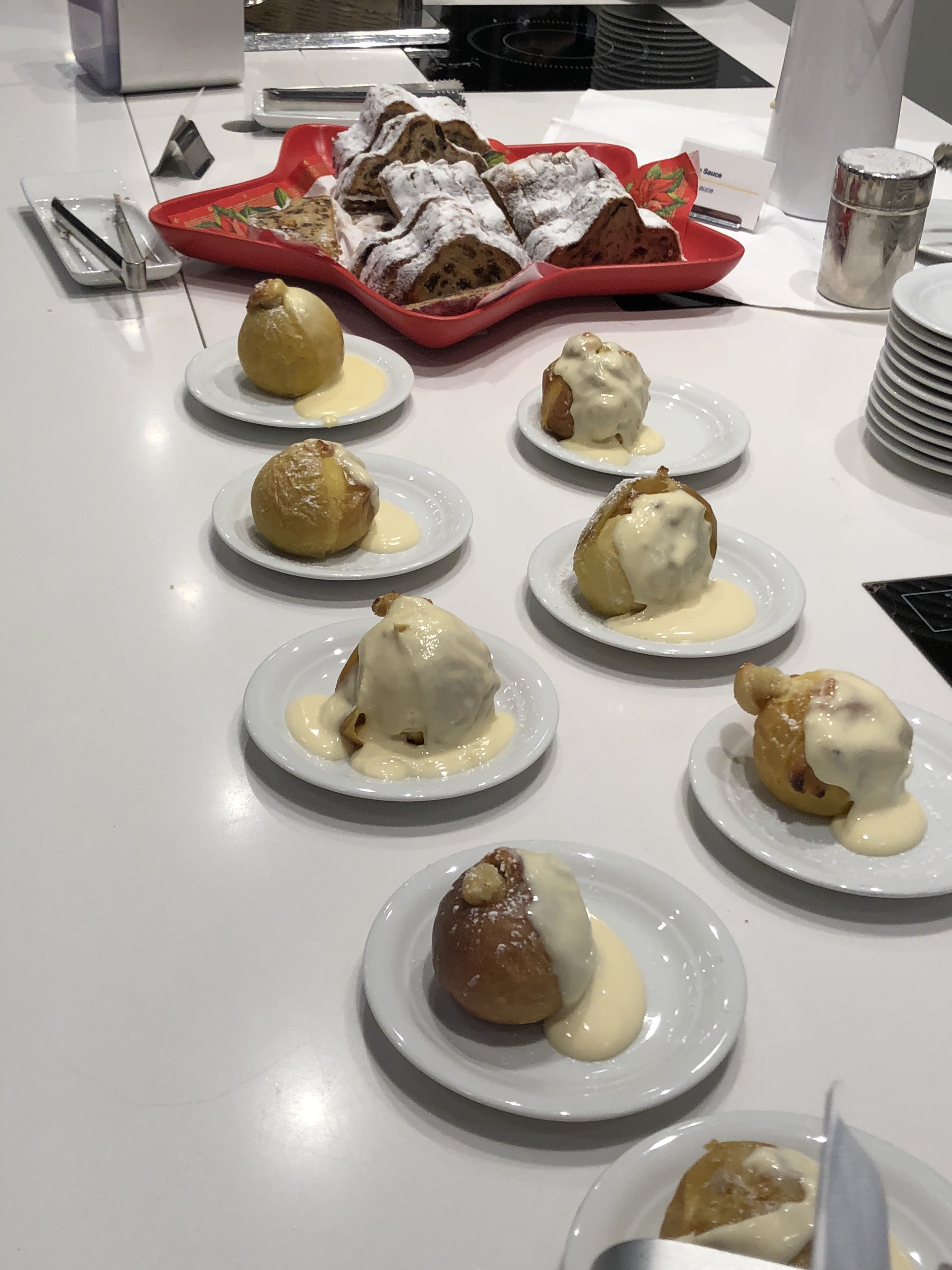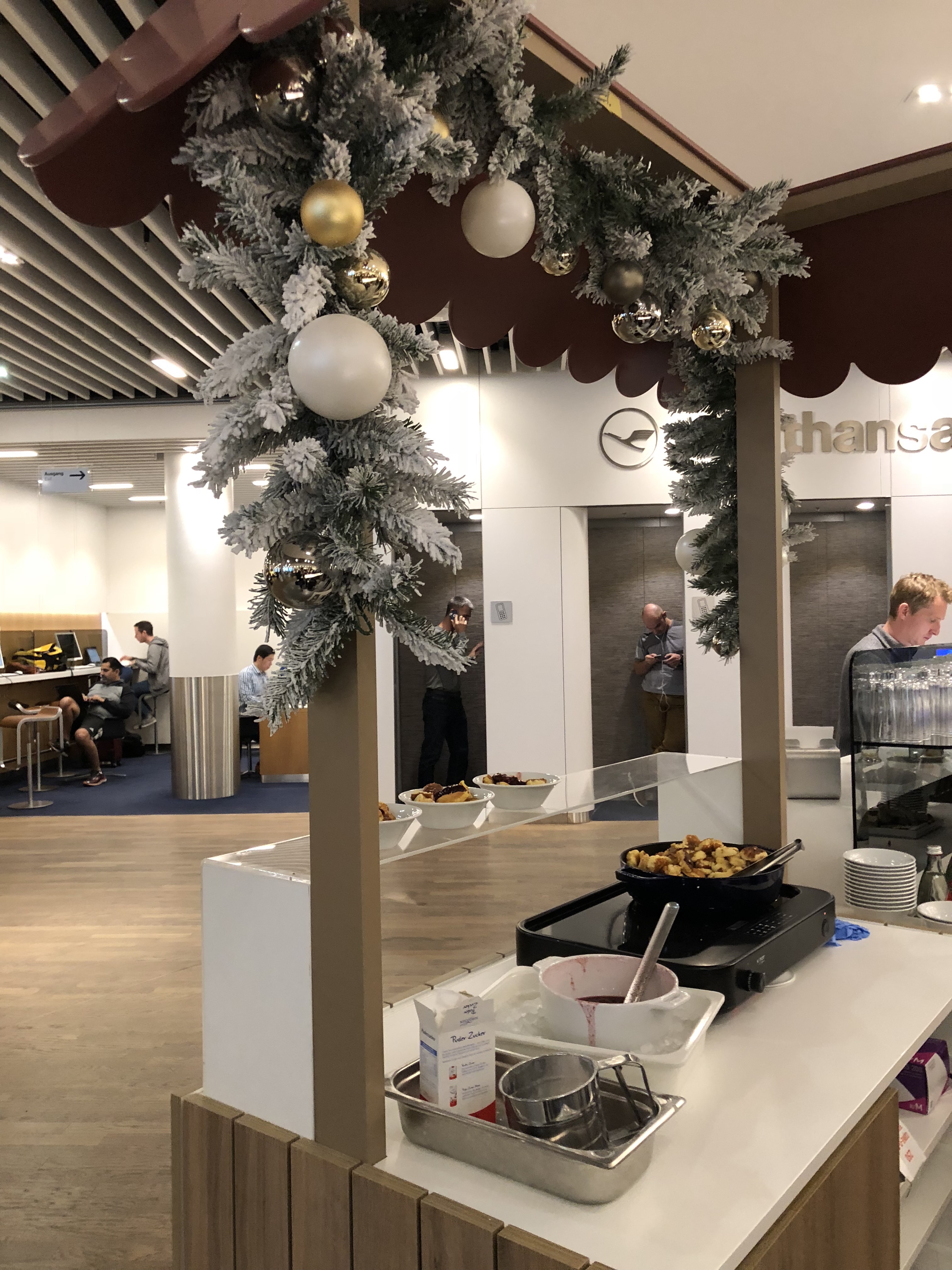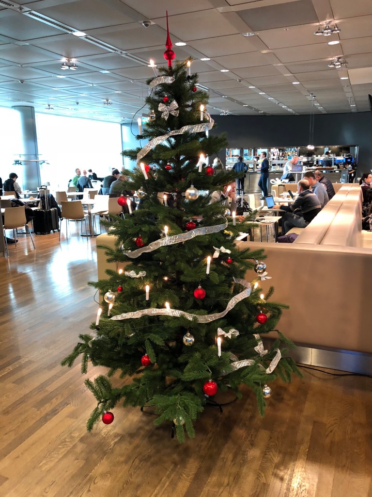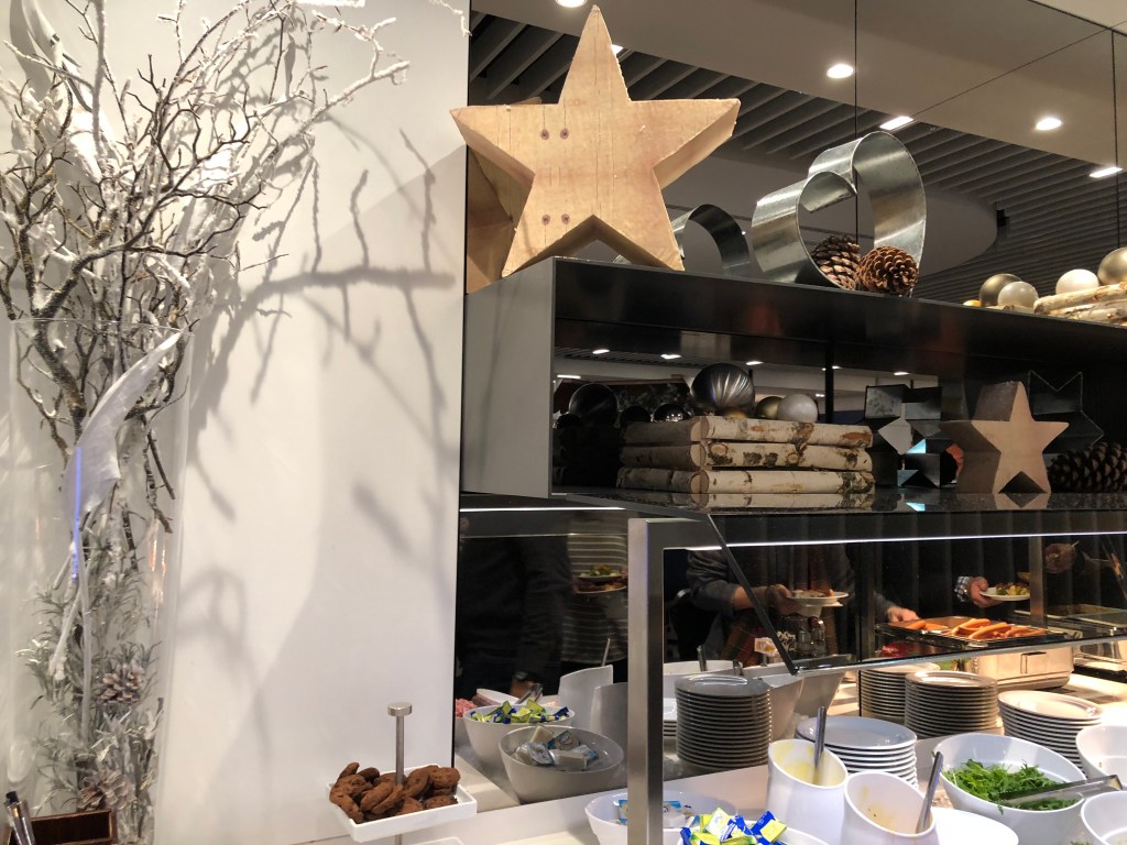 Once I’d showered, I had about a half hour more to explore the lounge before boarding, so I walked around and snapped some food pictures. Contrary to the Munich lounge, this one was much more festive and featured snowy and woodsy-themed decorations. There were also Christmas-related dishes on offer, from bread pudding, fruitcake, and roasted apples. I nibbled on some fruitcake, but before long it was time for boarding. I had an additional document check prior to boarding, which sometimes happens prior to US-bound flights. One glance at my passport and I was let on right away. I was absolutely thrilled to be embarking on this last flight of a packed year, and experiencing United’s new business class product for the first time!