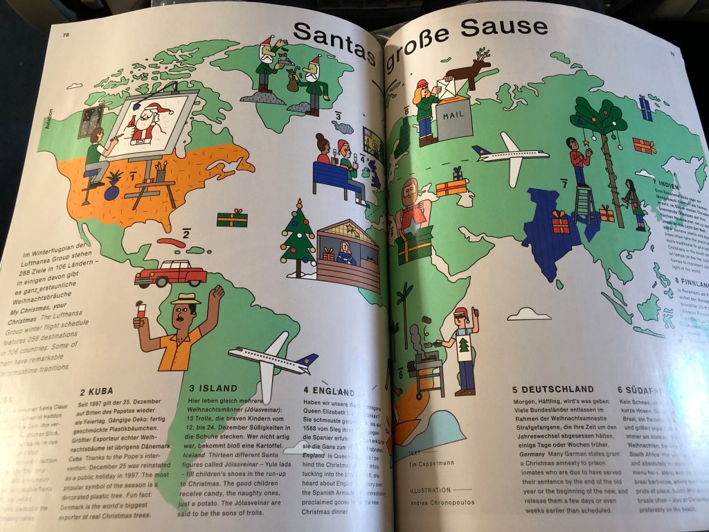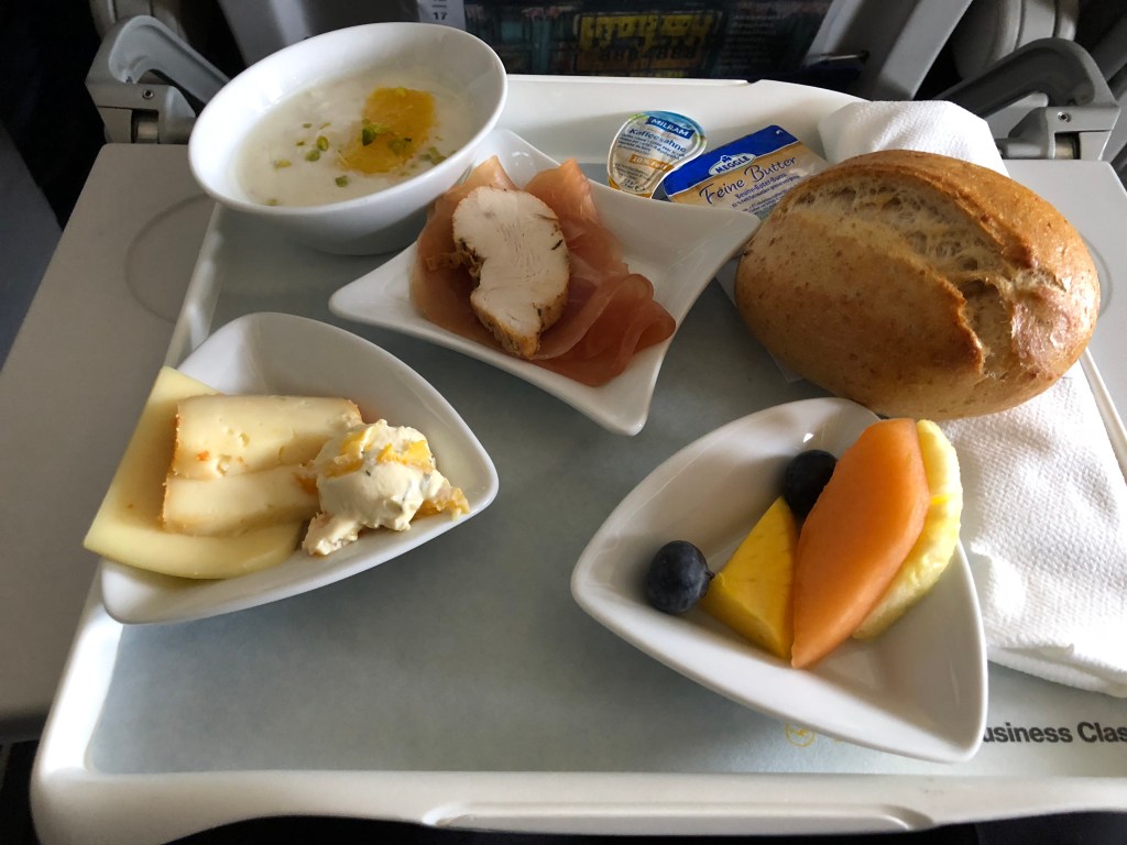 The only thing that really surprised me about this flight was just how many business class seats were allocated. Unlike most airlines which make their business class seats larger, the trend in Europe is to have the seats be the same as in economy but with the middle one blocked off. This means that the cabin size can be adjusted by moving the dividing curtain further up when the load is light, and further back when demand is high. My flight had a staggering 16 rows of business class, equating to 64 people in the cabin. The curtain dividing us from economy was over halfway back in the plane! Otherwise, the flight really felt like an economy one where I lucked out in having an empty seat next to me. The only difference was that this time, I got a meal. It was pretty decently sized, with cheese, meats, muesli, bread, and a bit of fruit on the side. Since I was hungry I finished it all, though I wasn’t thrilled about the quality of anything. I spent the rest of this short flight leafing through the inflight magazine, which felt like a Christmas catalog this month.