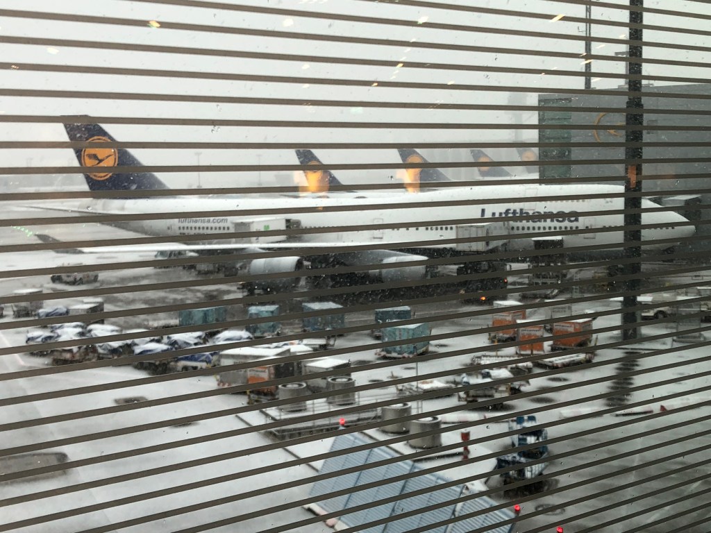 Despite it being sunny when I left Munich, we descended into a light blizzard in Frankfurt. The swirling snow didn’t seem to delay our taxi to the gate, and we were off in time. Luckily for me, we exited right next to the line to clear immigration and leave the Schengen area. By the time I did, it was about an hour before my United flight back to SFO boarded. I went straight to the Lufthansa Senator lounge and requested a shower pager, since you never know how long the line might be. Even though the lounge was bustling, it only took me 10 minutes to get a room. It was sort of clear why once I got there, as the shower room wasn’t particularly nice and the toiletries were pretty bare bones. Still, I felt pretty filthy after my long morning and was glad to get more refreshed before my flight.