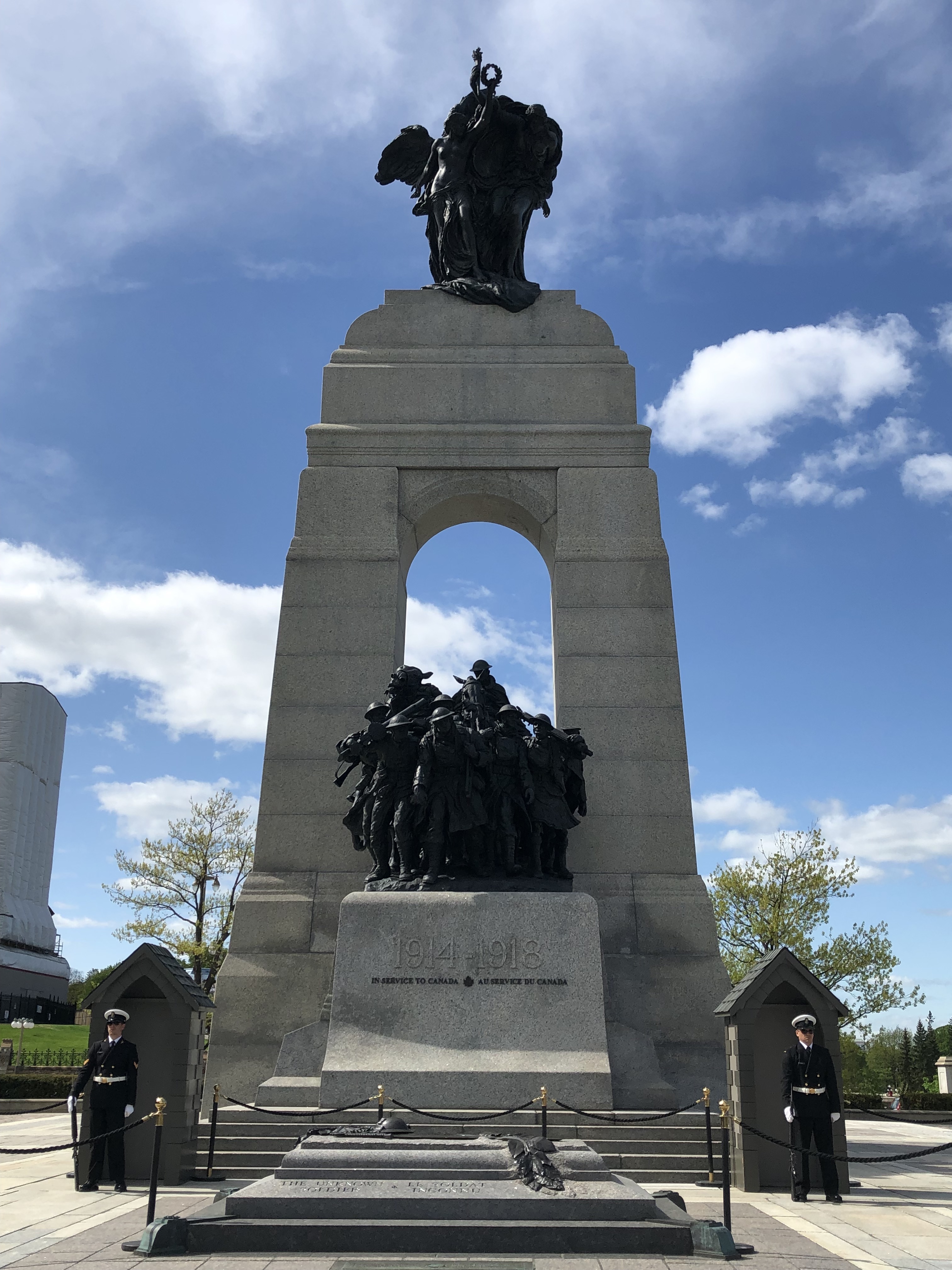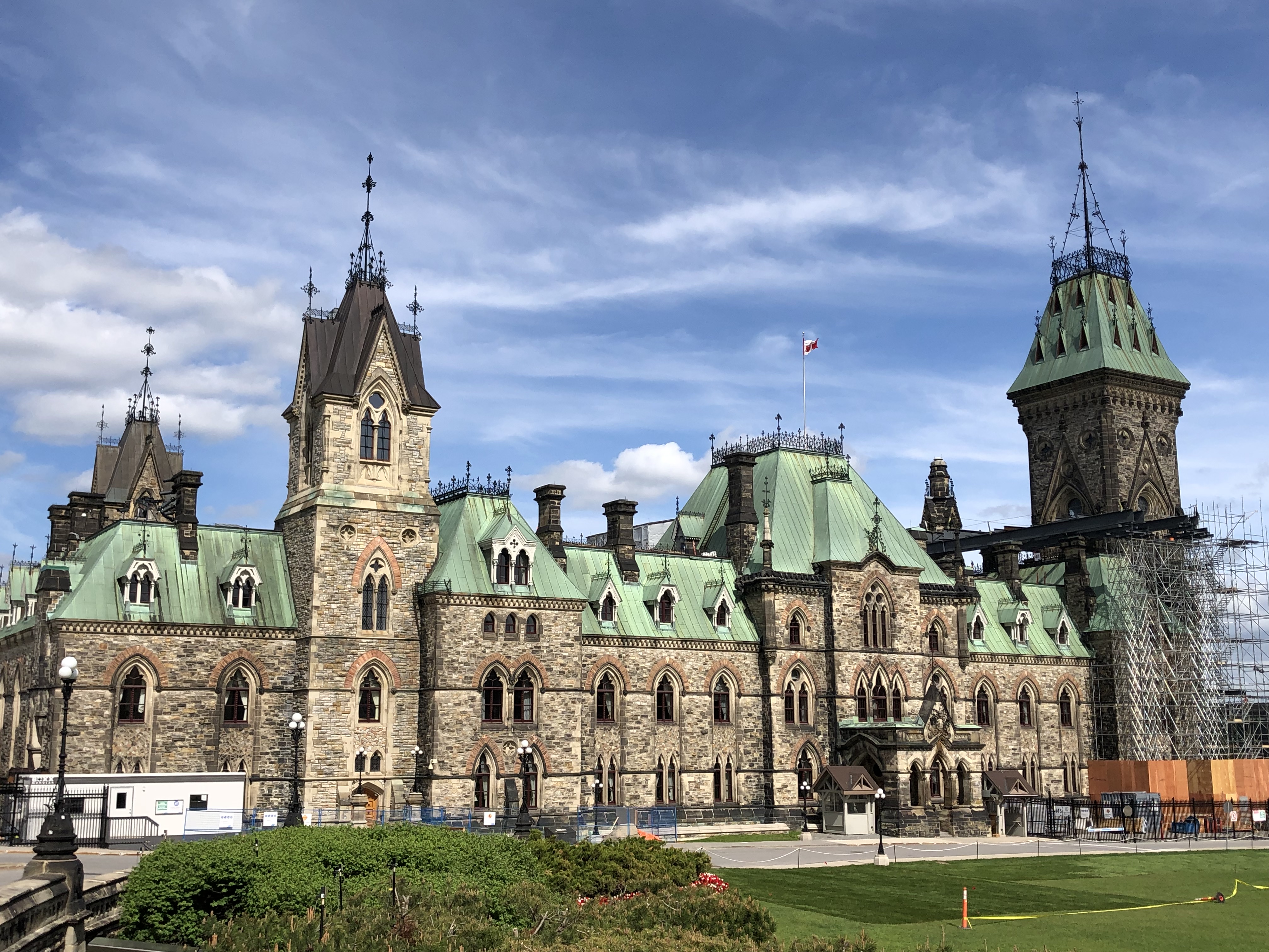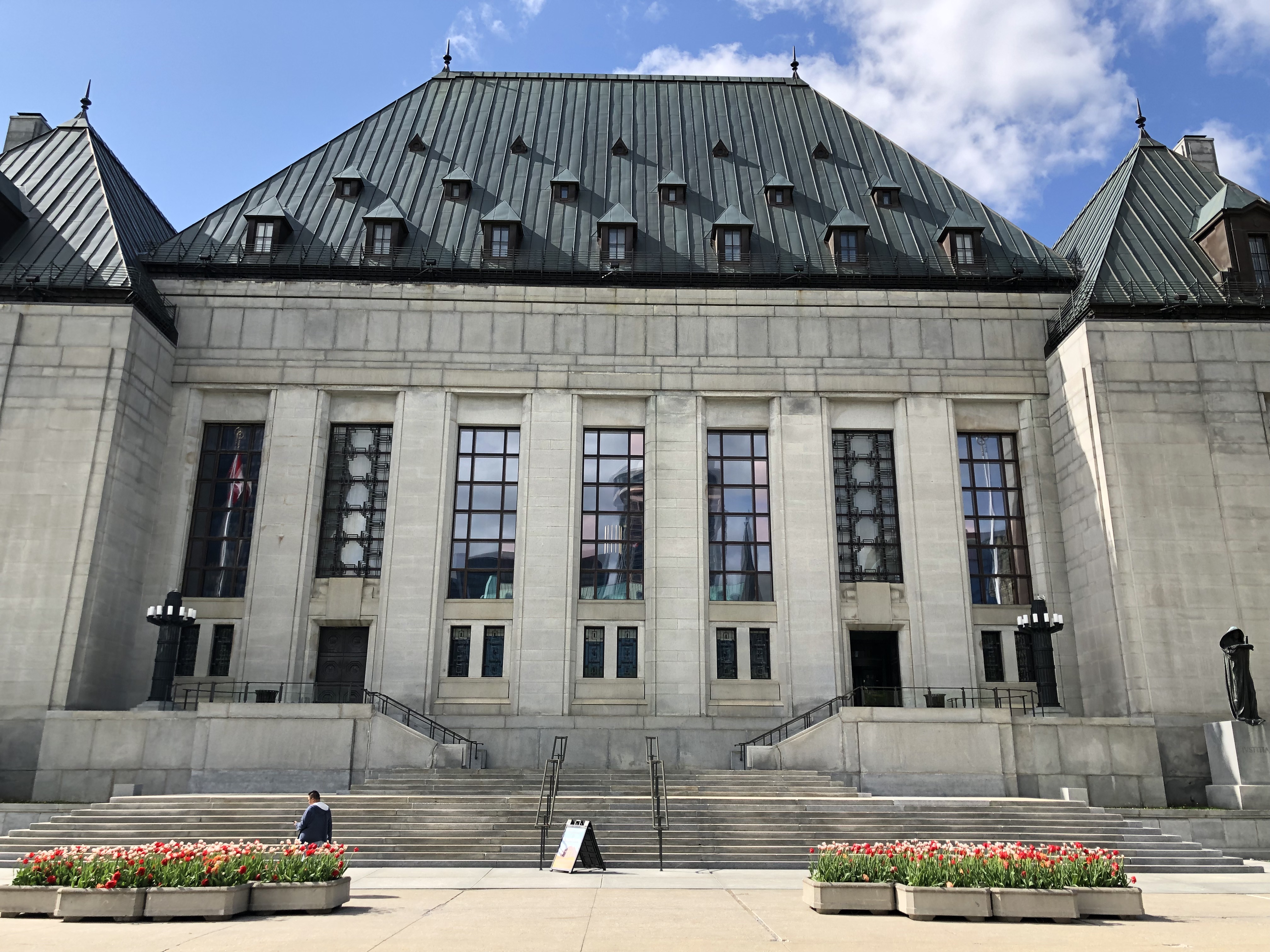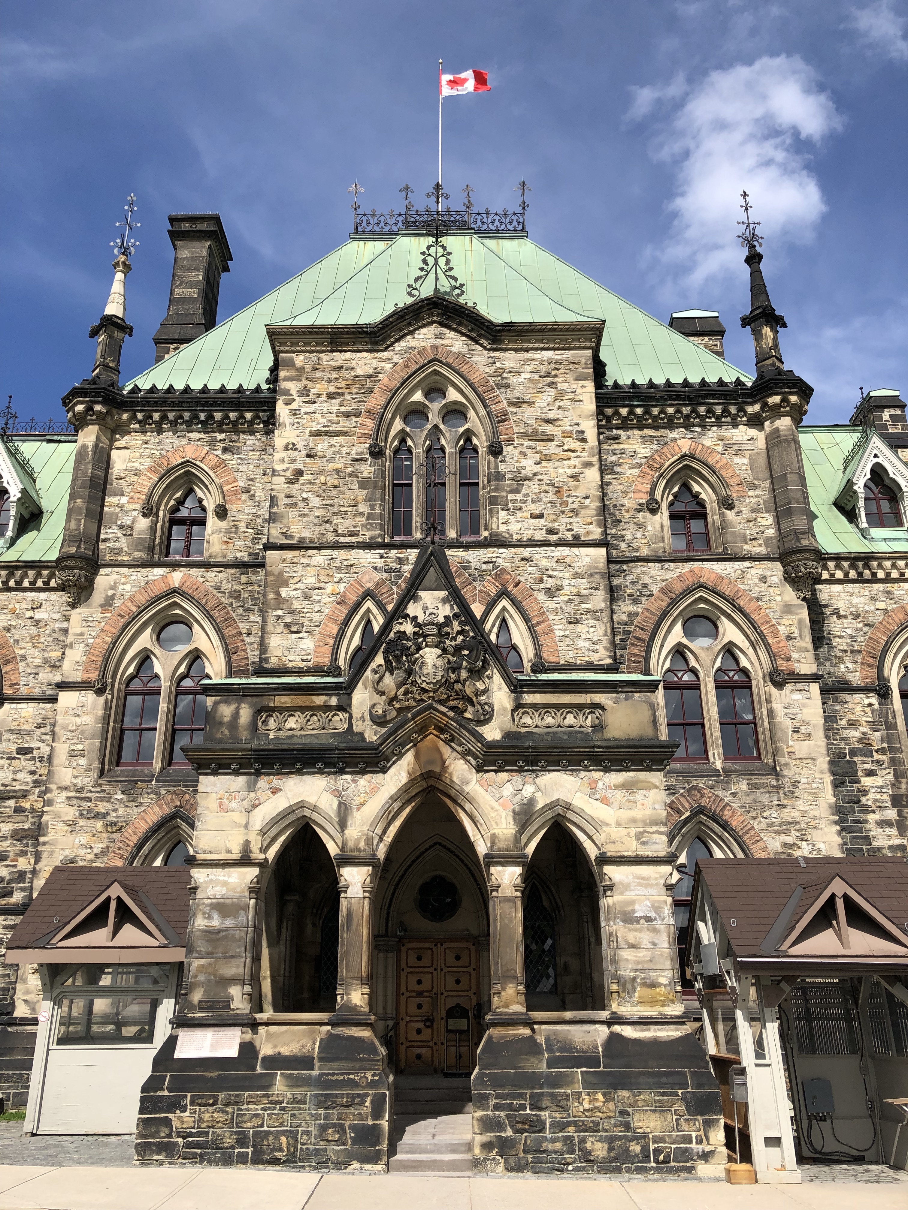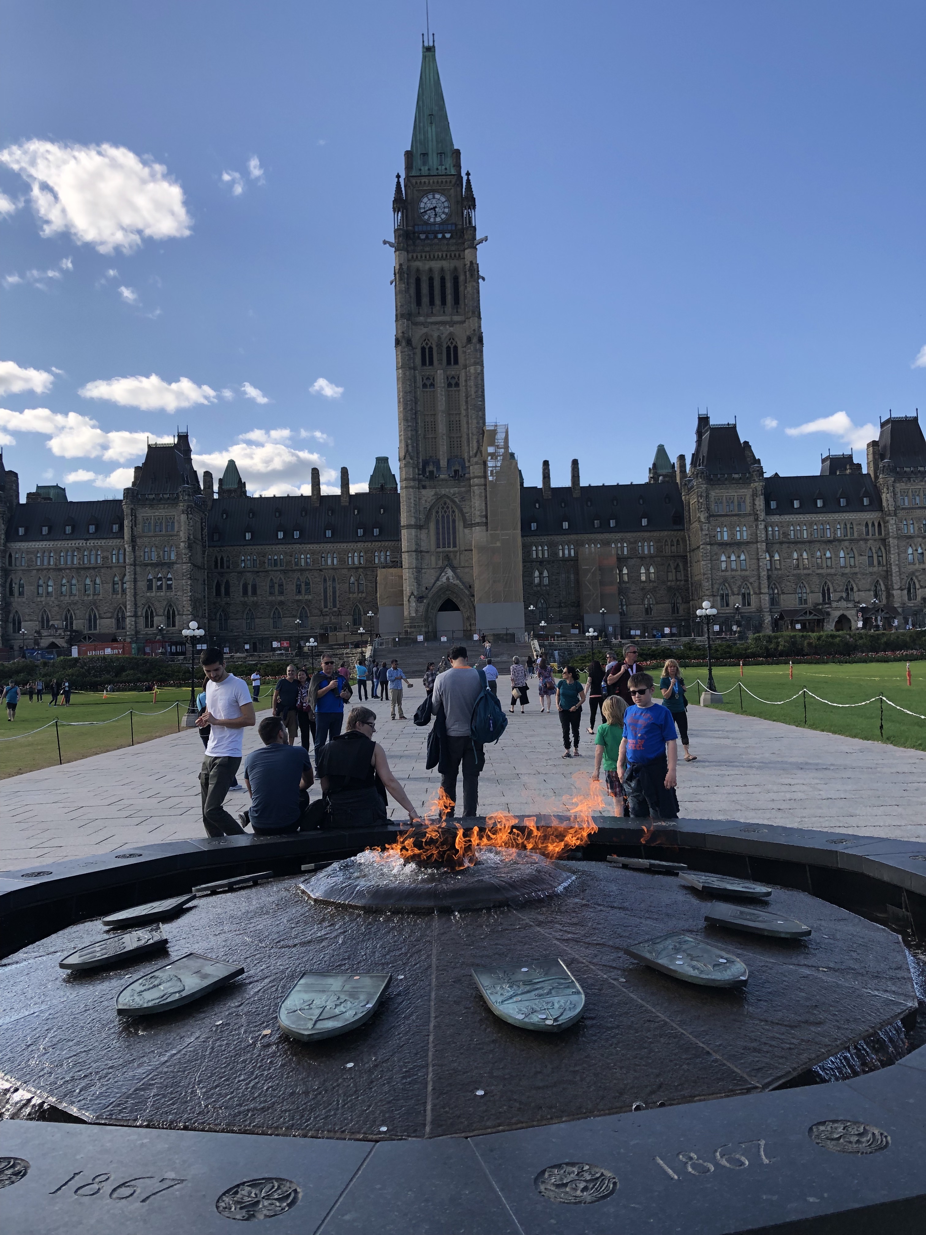 Once I had recovered enough from running my race, I hopped (or more honestly, limped), back into tourist mode. Ottawa allows visitors on timed tours into some of its buildings, and I was able to get a 4 p.m. tour through the parliament buildings. I finished my late lunch at Pure Kitchen on Elgin about an hour before the tour, but it took me nearly a half hour to amble over to Parliament Hill. Still, that left me with enough time to wander around and take pictures of some of the landmarks. One of the most striking were monuments to each of the wars that Canadian soldiers had fought in, notably the two World Wars and the Korean war. Upon closer look, it was more clear that the bricks of the parliament buildings were starting to blacken and be stained with soot. One by one, they were actually being renovated, and construction scaffolding was propped up on a couple buildings, the most noticeable of which was the base of the clock tower. There was an eternal flame memorial to commemorate the nation’s centennial anniversary in 1967, framed nicely in front of the clock tower. Before my tour, I had just enough time to stop by their Supreme Court building as well. Here’s what they looked like: