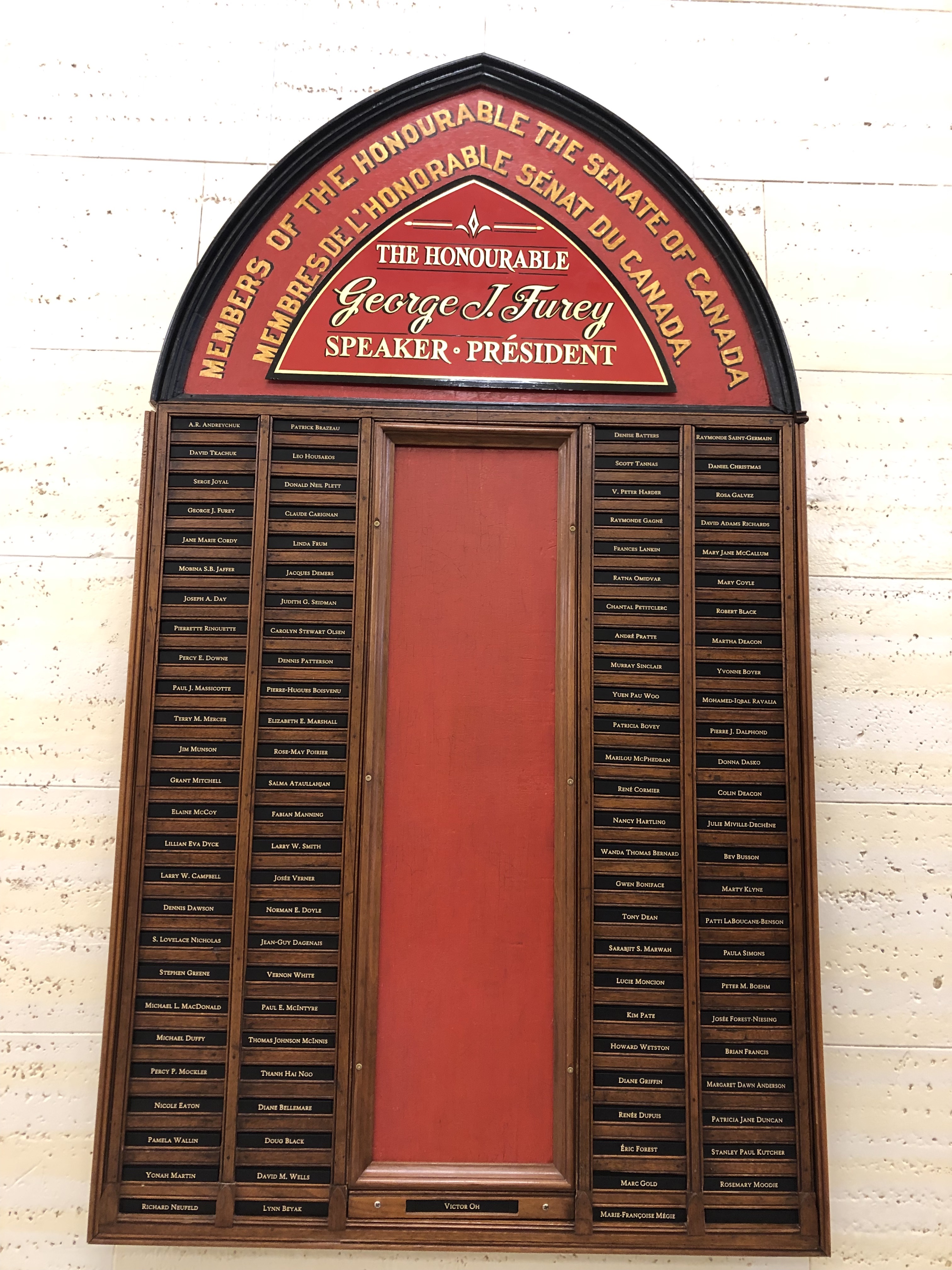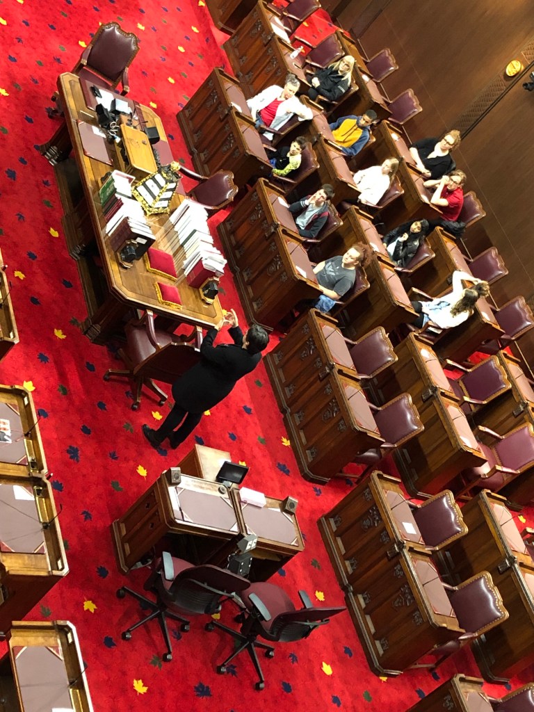 The next morning, I managed to snag entry for a Senate chamber tour at 10:15 a.m. Although I had the Memorial Day off in the states, it was business as usual for Ottawa on this Monday and I was left to myself in most of the places I visited today. After getting a kickstart with a cappuccino at Equator coffee, I made my way to the Senate building, just alongside the Rideau canal. Unlike the older Parliament buildings, the entrance to this one was high and vaulted, supported with Greek columns. The steel and glass windows above reminded me of a train terminal, something like New York’s Grand Central. This tour actually ended up being a good bit shorter than the parliament tour I had. The senate wasn’t in session today, so we were able to visit each of the chambers. We also witnessed a school group seated in the senate members’ usual chairs, something casual that I wouldn’t expect in our nation’s capitol but thought was cool to see here. Even the security guards at the front of the room seemed to enjoy watching the kids learn more about their nation’s government in the chambers themselves. Members’ names were still prefaced with “the right honourable”, establishing it as a trend to me. Lastly, the chamber doors had the emblems of each of the 10 Canadian provinces and 3 territories emblazoned on it. Props to anyone who can identify each one!