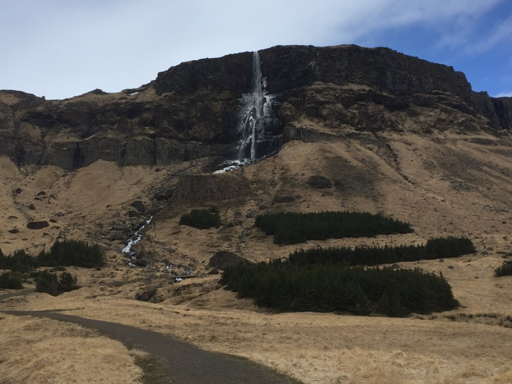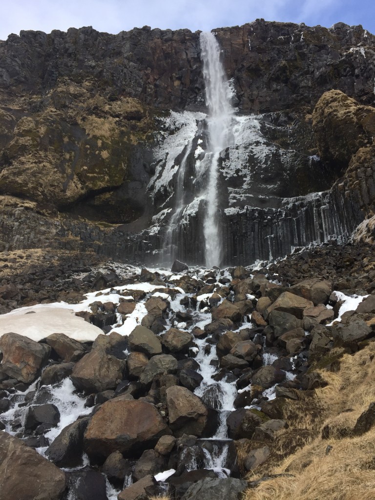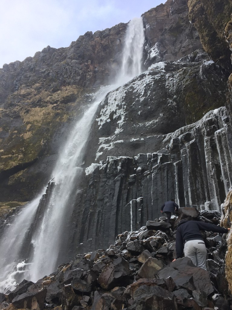 What really made this hike special was that, once we got closer to the waterfall, we could see that some of the smaller flows on the side were actually frozen! The white patches on the cliffside that we thought were snow were actually ice that hadn’t melted yet. We scrambled eagerly, but safely, up the boulder field to get a closer look. At the very top was another surprise: some of the hexagonal rock columns on the lower part of the falls was actually frozen water! The coating of ice on these pillars made them appear like they shimmered, and when we got closer we could observe the bumpy pattern that this ice had. It looked almost like the droplets from the falls had frozen in place, but this rough texture probably came from the mist of the falls blowing into the pillars and then freezing. The ice coated a few of the boulders near the pillars, so we had to really watch our step here. We took quite a while just marveling at the frozen patterns that the ice formed on the side of the falls, and the falls themselves, before heading back down together.