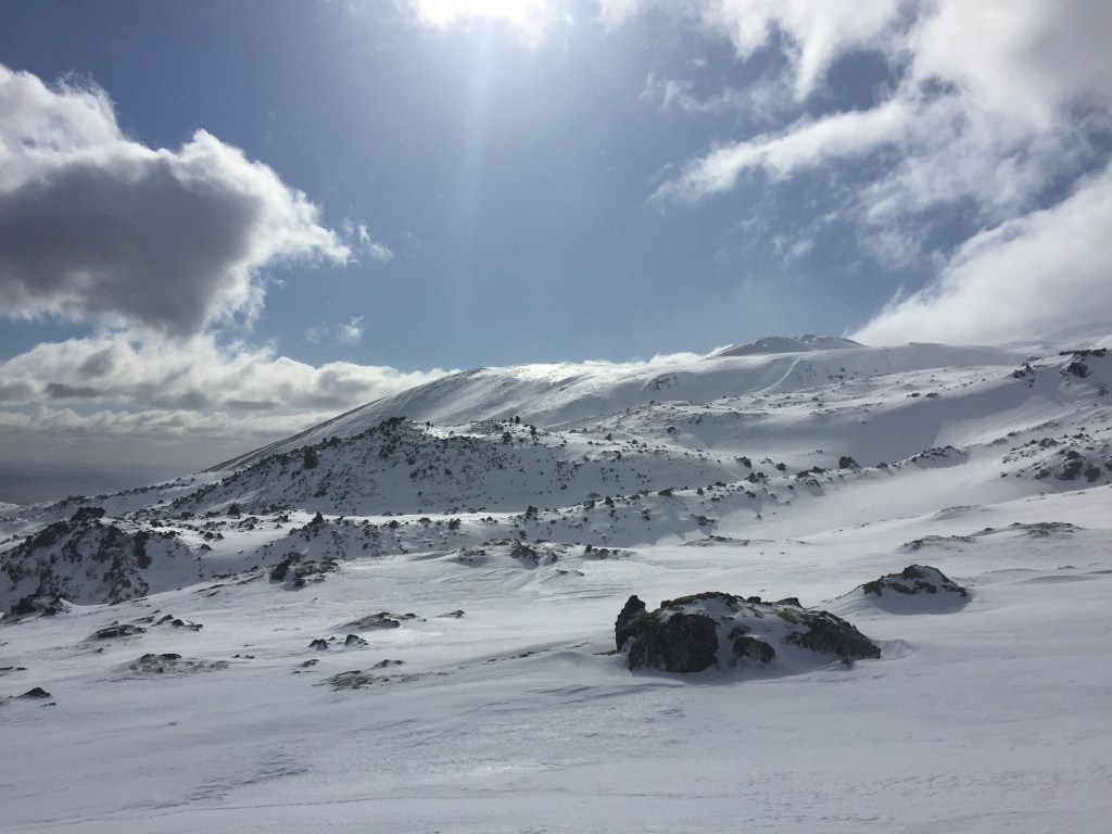 We ended up making our first stop at a waterfall that we found tumbling over the Snaefellsnes peninsula’s plateau. Although the waterfall looked to be active, it was surrounded by a coating of snow, which piqued our interest. We parked the car and followed a path leading upwards, to the base of the falls. The path got steeper quicker than we anticipated, which got us climbing up on hands and knees at a couple points. Thankfully, this wasn’t one of those cases where the waterfall looks a lot closer than it actually is. It took us just under an hour to climb to the top, where we were greeted with sweeping views of the peninsula and the bay to the south.