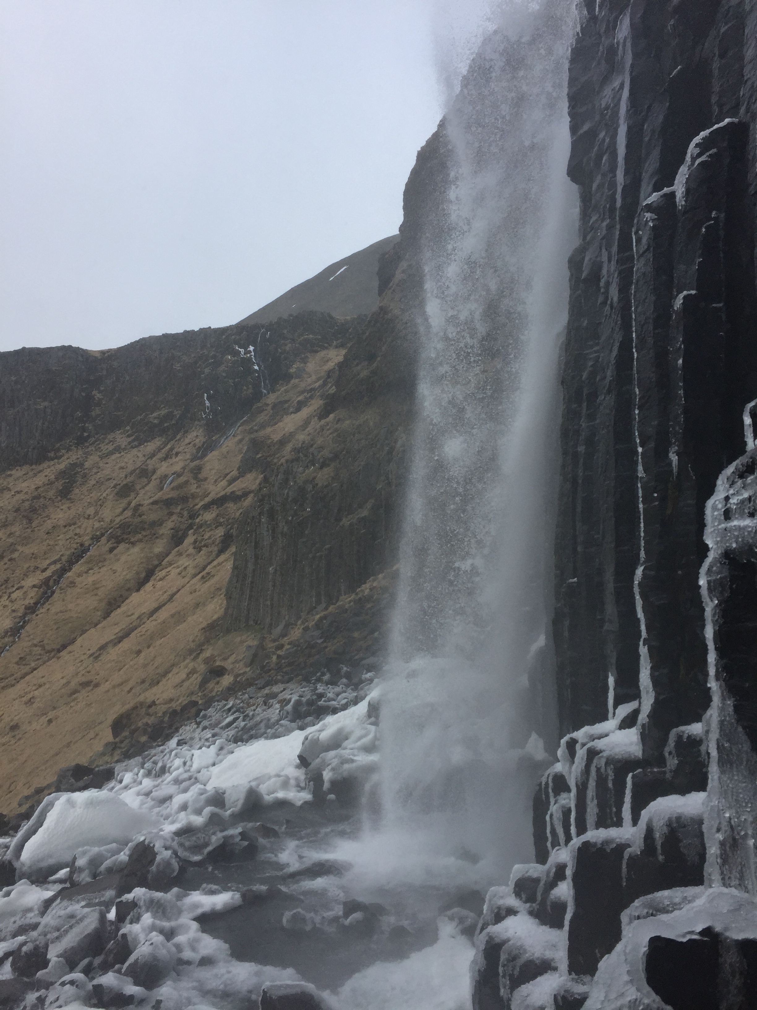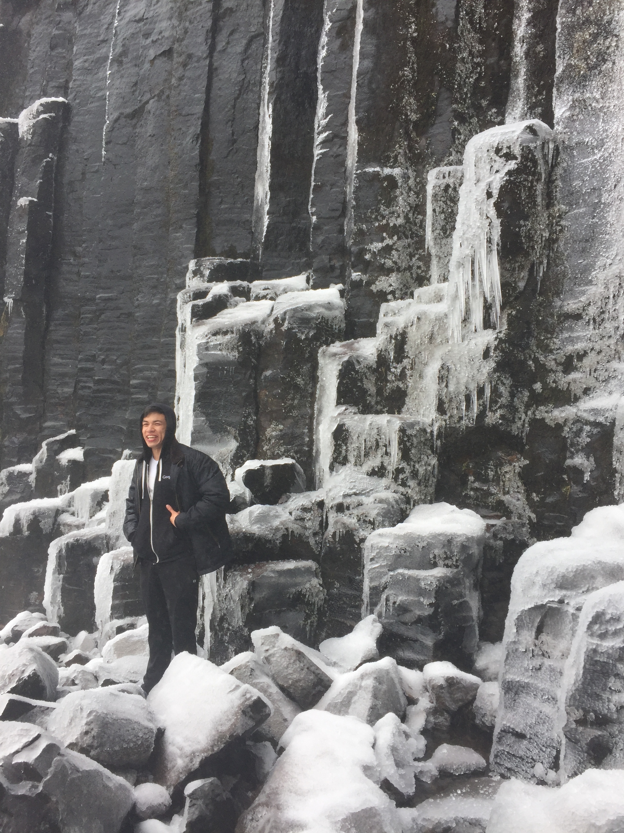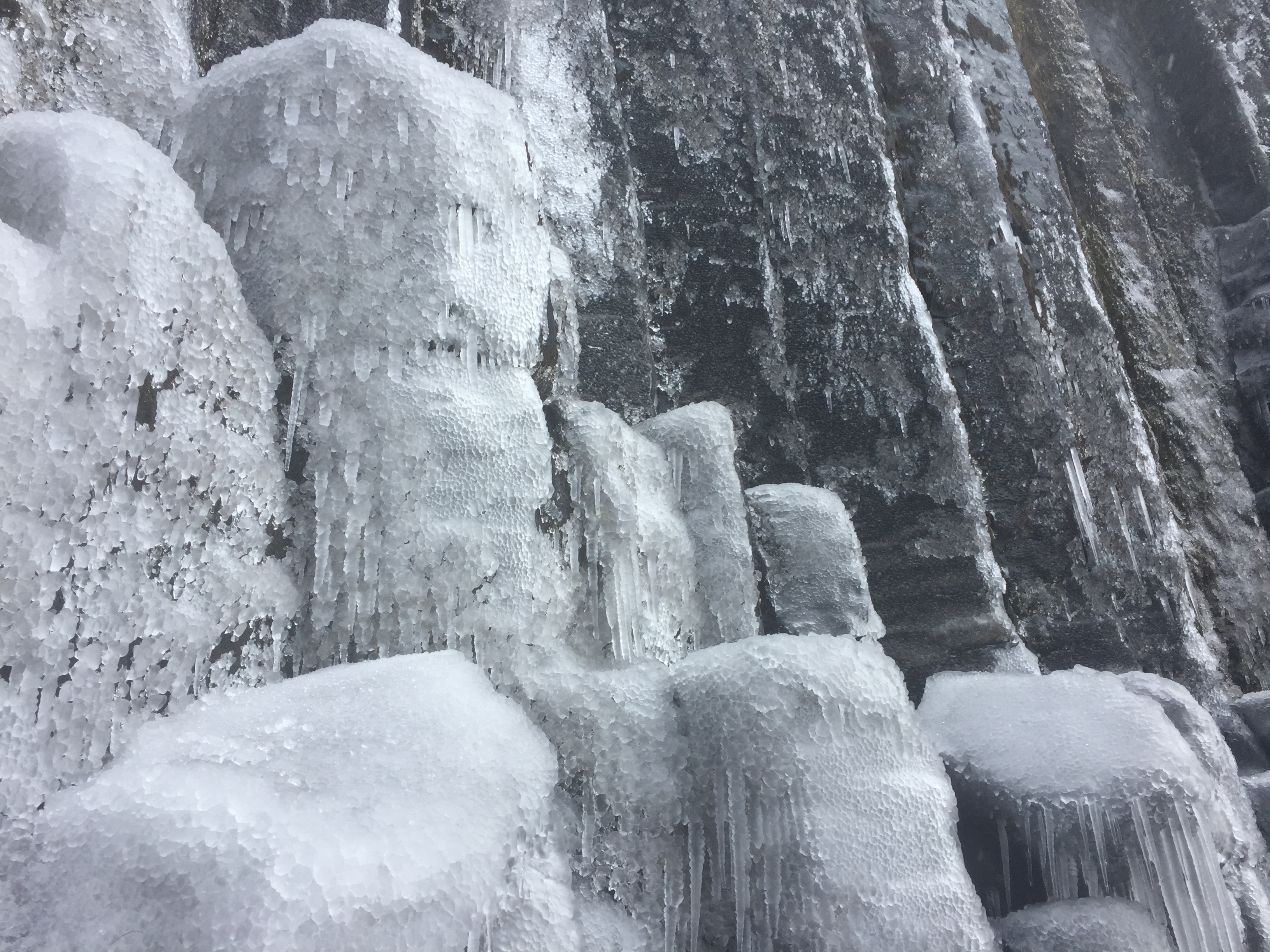 What really made this hike special was that, once we got closer to the waterfall, we could see that some of the smaller flows on the side were actually frozen! The white patches on the cliffside that we thought were snow were actually ice that hadn’t melted yet. We scrambled eagerly, but safely, up the boulder field to get a closer look. At the very top was another surprise: some of the hexagonal rock columns on the lower part of the falls was actually frozen water! The coating of ice on these pillars made them appear like they shimmered, and when we got closer we could observe the bumpy pattern that this ice had. It looked almost like the droplets from the falls had frozen in place, but this rough texture probably came from the mist of the falls blowing into the pillars and then freezing. The ice coated a few of the boulders near the pillars, so we had to really watch our step here. We took quite a while just marveling at the frozen patterns that the ice formed on the side of the falls, and the falls themselves, before heading back down together.