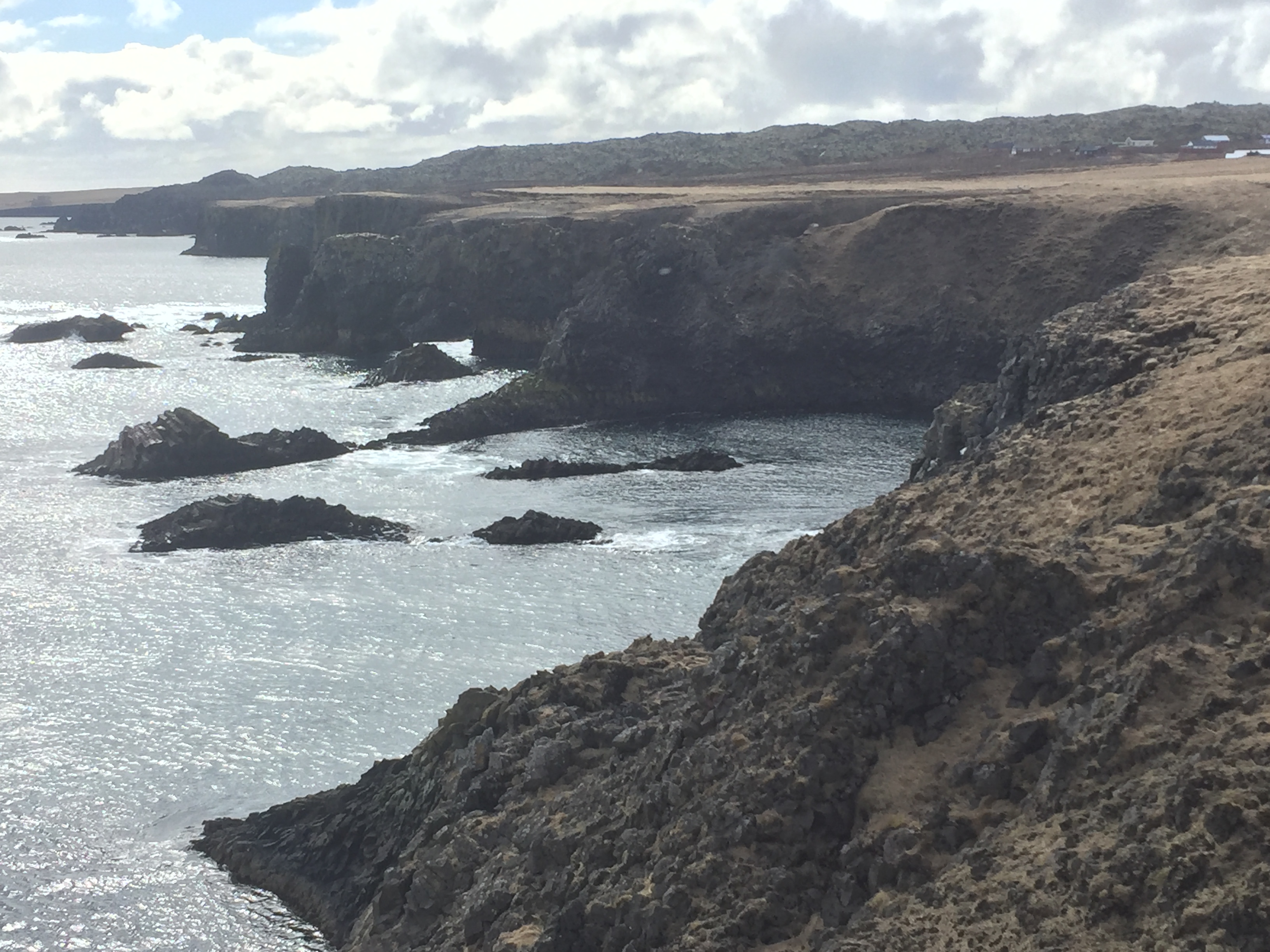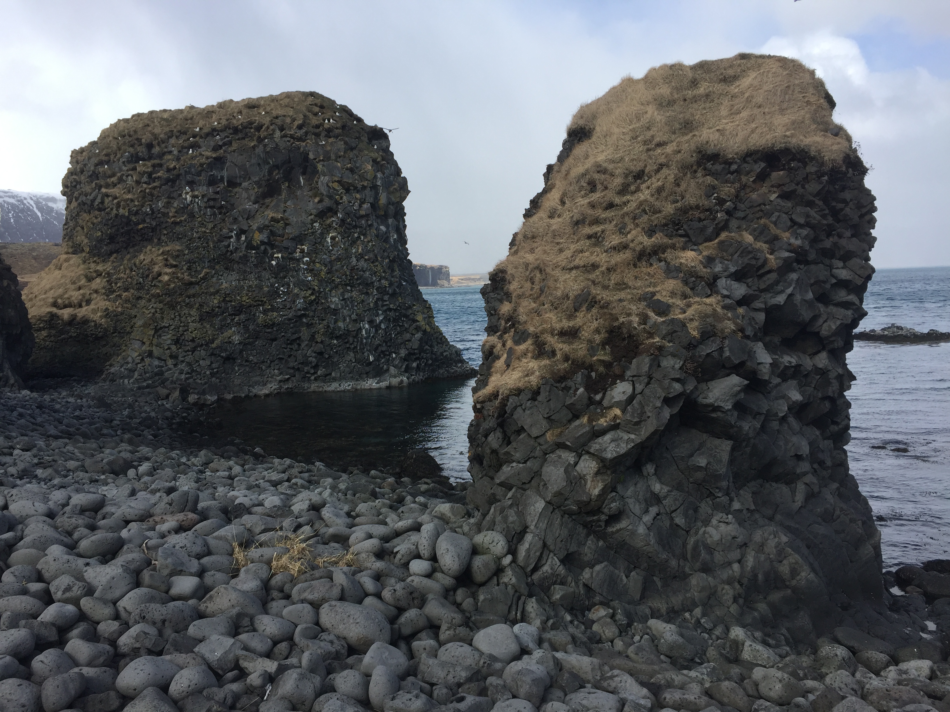 One last delight on our descent was another batch of snow flurries that picked up once we’d left the boulder field. I normally don’t like the cold, but I have a great time when the snow flutters all around me. We scampered back down to our car in high spirits, and blasted Mariah Carey’s “All I Want for Christmas” when we got back on the road. Pretty soon, we ended up in a small town called Hellnar, which had a single fish and chips shop for food. So, that was our lunch. After that, we got to wander around the rocky coast a bit, which was pretty scenic. After a half hour of wandering, it was time to get back in the car.