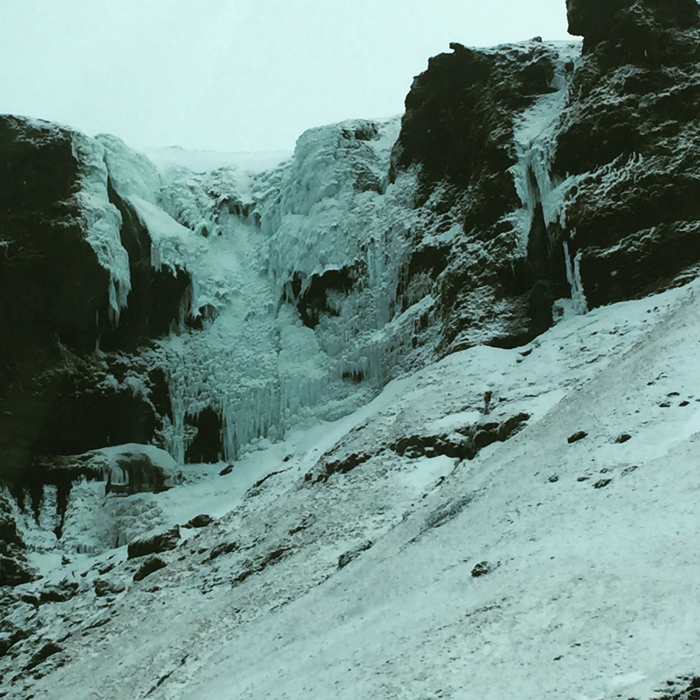 We ended up making our first stop at a waterfall that we found tumbling over the Snaefellsnes peninsula’s plateau. Although the waterfall looked to be active, it was surrounded by a coating of snow, which piqued our interest. We parked the car and followed a path leading upwards, to the base of the falls. The path got steeper quicker than we anticipated, which got us climbing up on hands and knees at a couple points. Thankfully, this wasn’t one of those cases where the waterfall looks a lot closer than it actually is. It took us just under an hour to climb to the top, where we were greeted with sweeping views of the peninsula and the bay to the south.