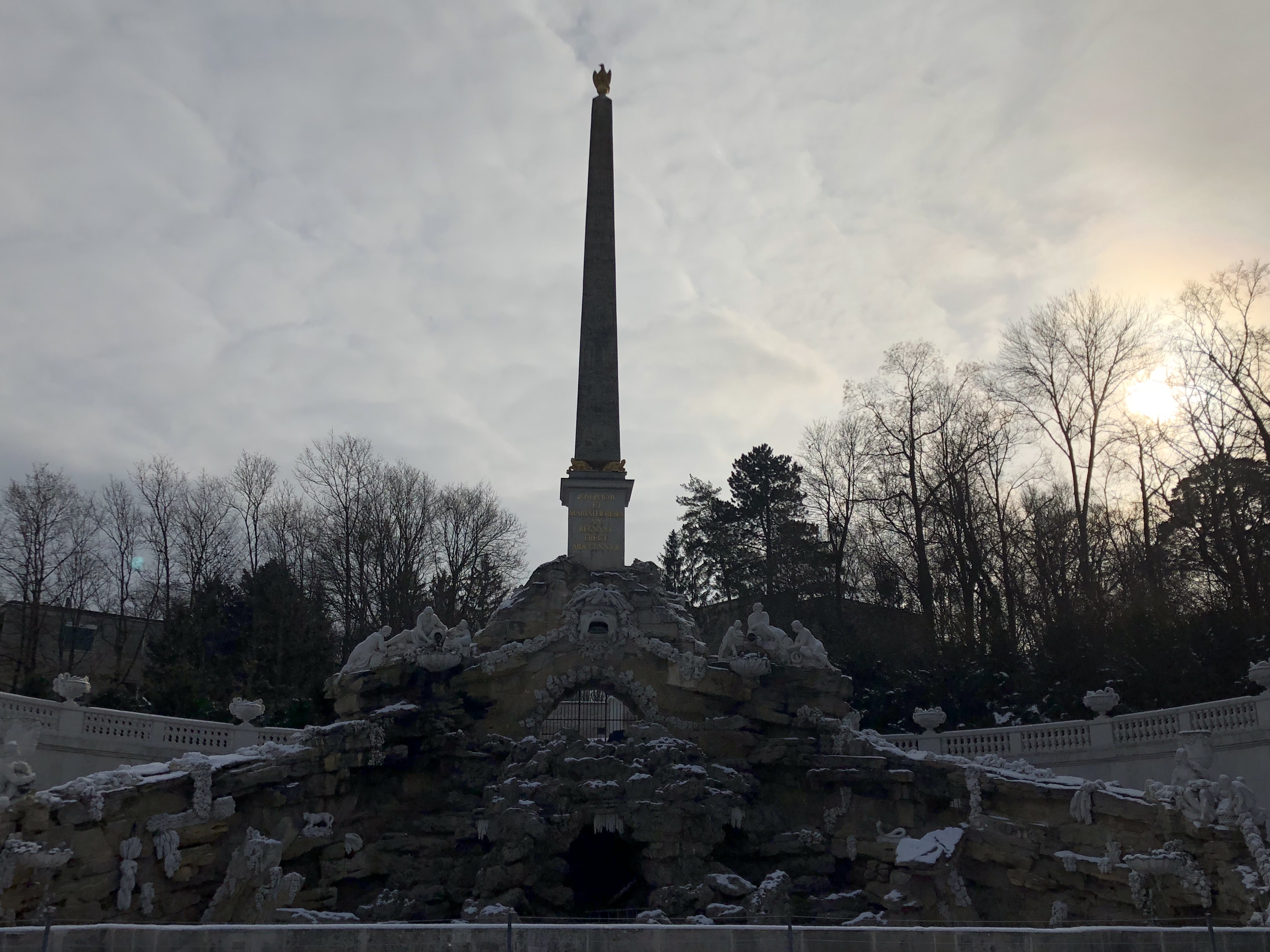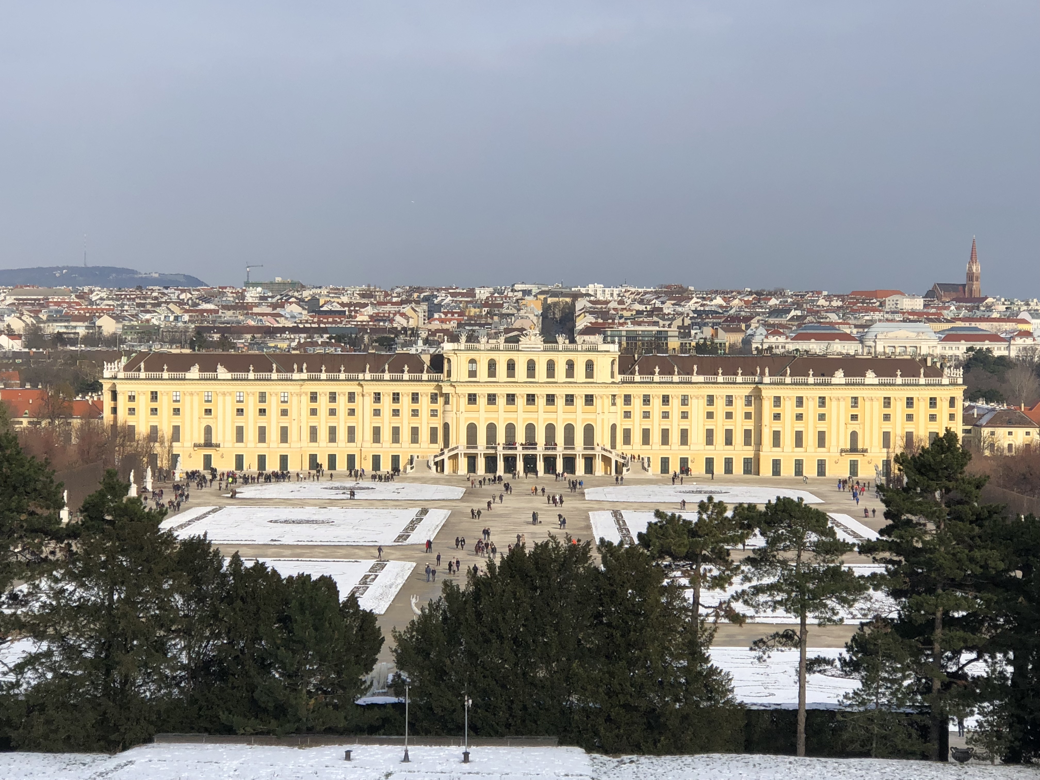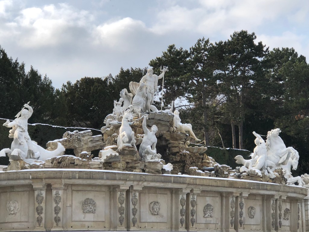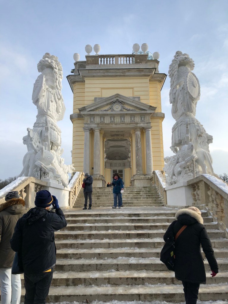 We flew into Vienna at around 4:30 p.m. on a Saturday, and were due to take a train out at 11:30 a.m. two days later. The day we landed, we didn’t have much time or energy to do anything other than get dinner and visit a nighttime Christmas market, which I’ll be writing about later. Thankfully, none of us were plagued by jetlag this time and we all slept a full 8 hours, and we managed to start our day around 9 a.m. Our group left the planning for Vienna to Joel, who was the most excited about visiting due to both the imperial and musical history of the city. After a quick breakfast near our AirBnB, we took the U-Bahn metro system to the Schonnbrunn palace. Even though it is reached by the metro now, in imperial times it took hours to travel the few miles from the city to the palace and that distance made it the family’s summer retreat. We were hoping to get entry tickets on arrival, but the tours were timed and the next one was 4 hours into the future. We decided that was too long, and spent time wandering around the monuments and gardens in back of the palace instead. They take up a massive amount of space, easily over a square kilometer. The ground and most statues were dressed in a fresh coat of snow, while the ponds all had a thin and transparent layer of ice. After about an hour and a half wandering through this snowy expanse, we took the U-bahn back towards the city center.