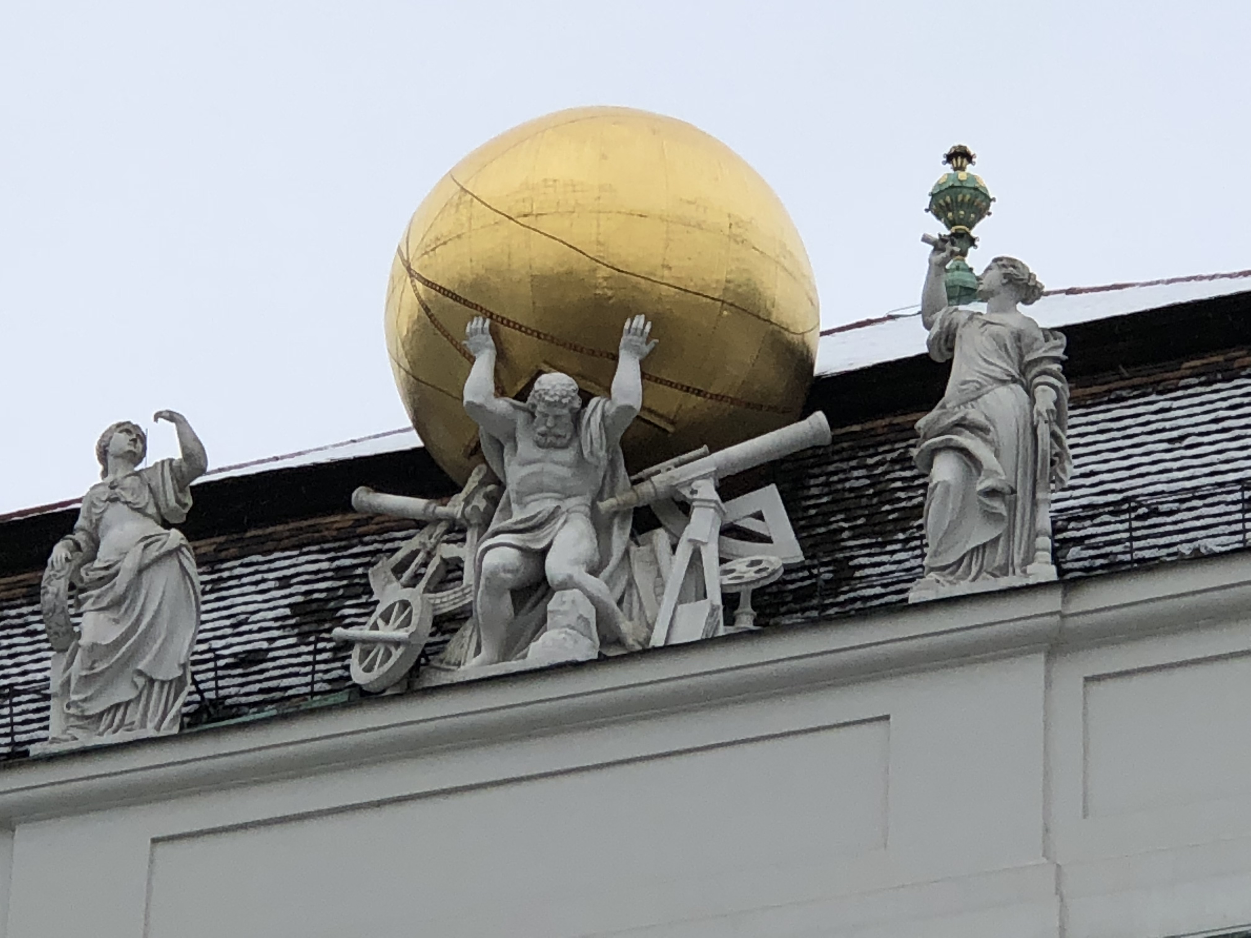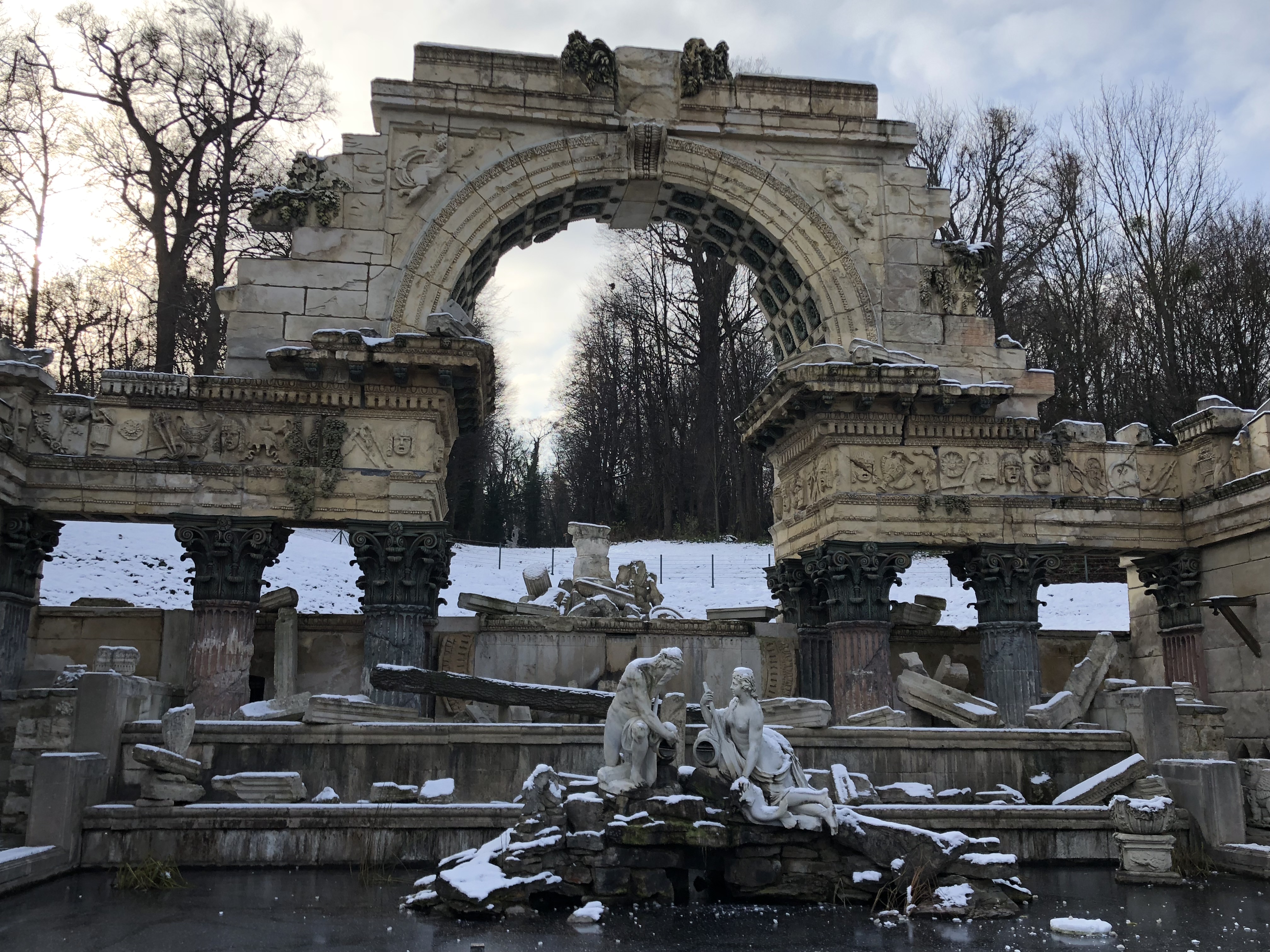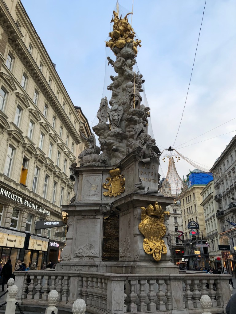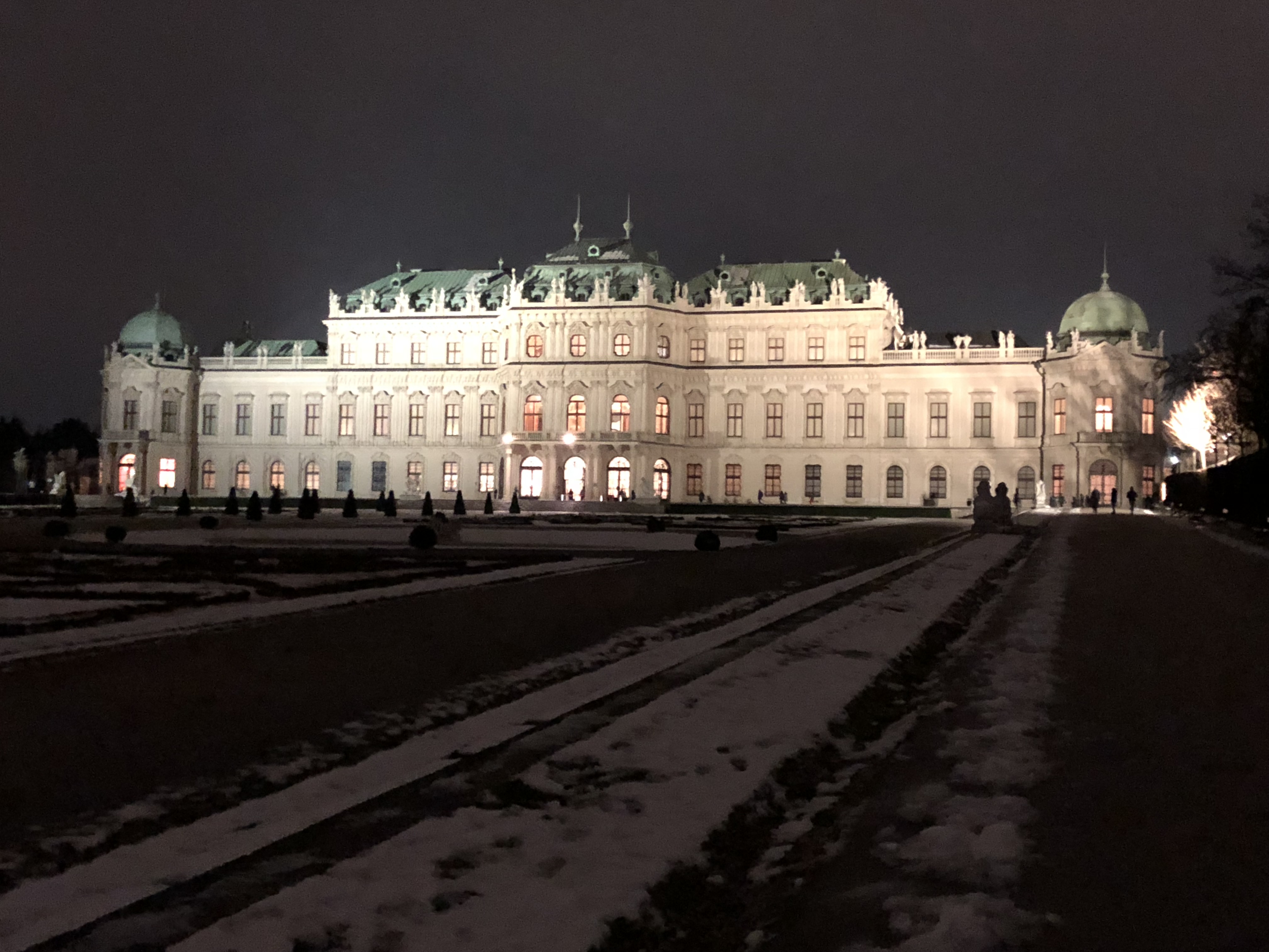 We flew into Vienna at around 4:30 p.m. on a Saturday, and were due to take a train out at 11:30 a.m. two days later. The day we landed, we didn’t have much time or energy to do anything other than get dinner and visit a nighttime Christmas market, which I’ll be writing about later. Thankfully, none of us were plagued by jetlag this time and we all slept a full 8 hours, and we managed to start our day around 9 a.m. Our group left the planning for Vienna to Joel, who was the most excited about visiting due to both the imperial and musical history of the city. After a quick breakfast near our AirBnB, we took the U-Bahn metro system to the Schonnbrunn palace. Even though it is reached by the metro now, in imperial times it took hours to travel the few miles from the city to the palace and that distance made it the family’s summer retreat. We were hoping to get entry tickets on arrival, but the tours were timed and the next one was 4 hours into the future. We decided that was too long, and spent time wandering around the monuments and gardens in back of the palace instead. They take up a massive amount of space, easily over a square kilometer. The ground and most statues were dressed in a fresh coat of snow, while the ponds all had a thin and transparent layer of ice. After about an hour and a half wandering through this snowy expanse, we took the U-bahn back towards the city center.