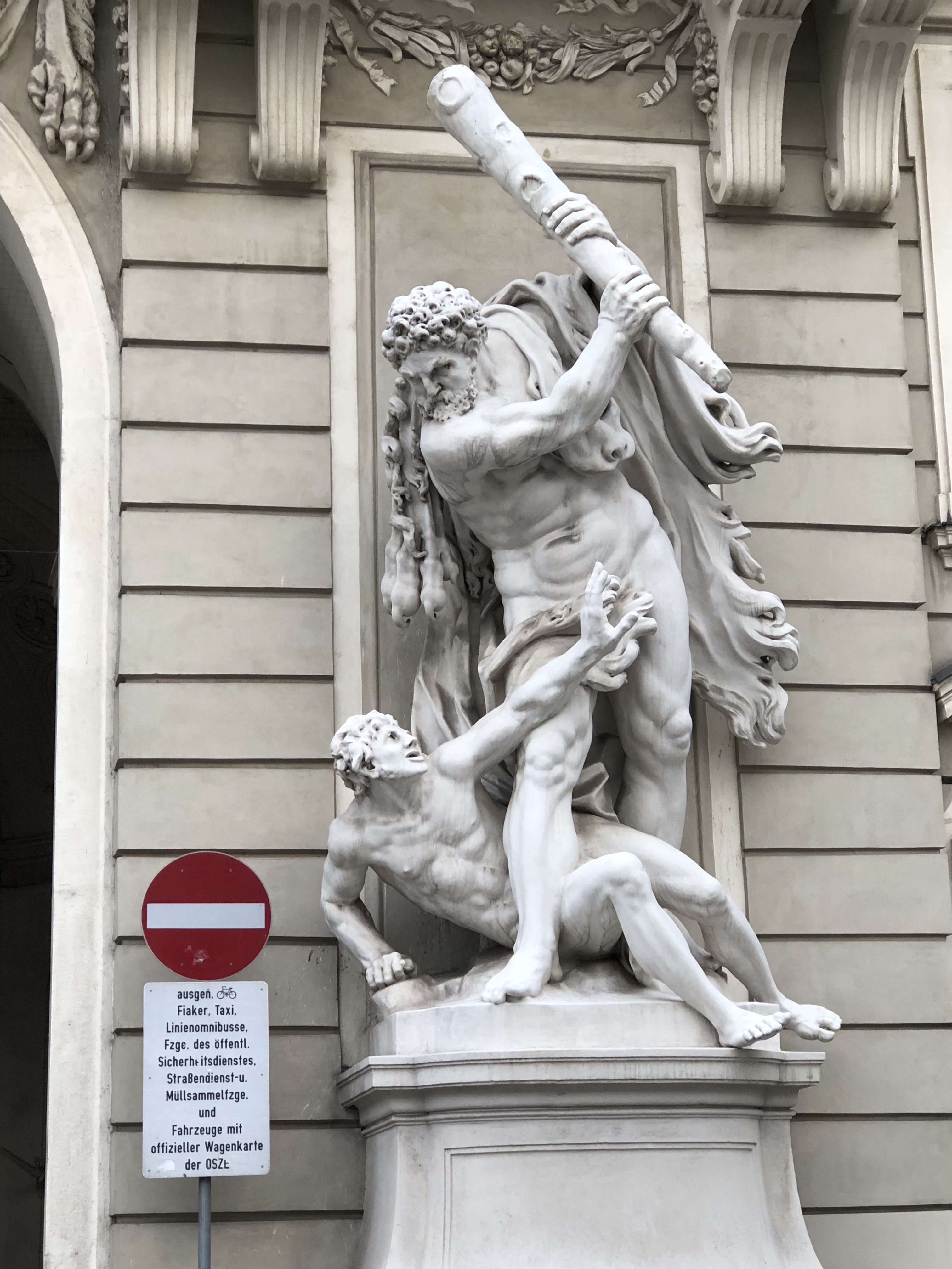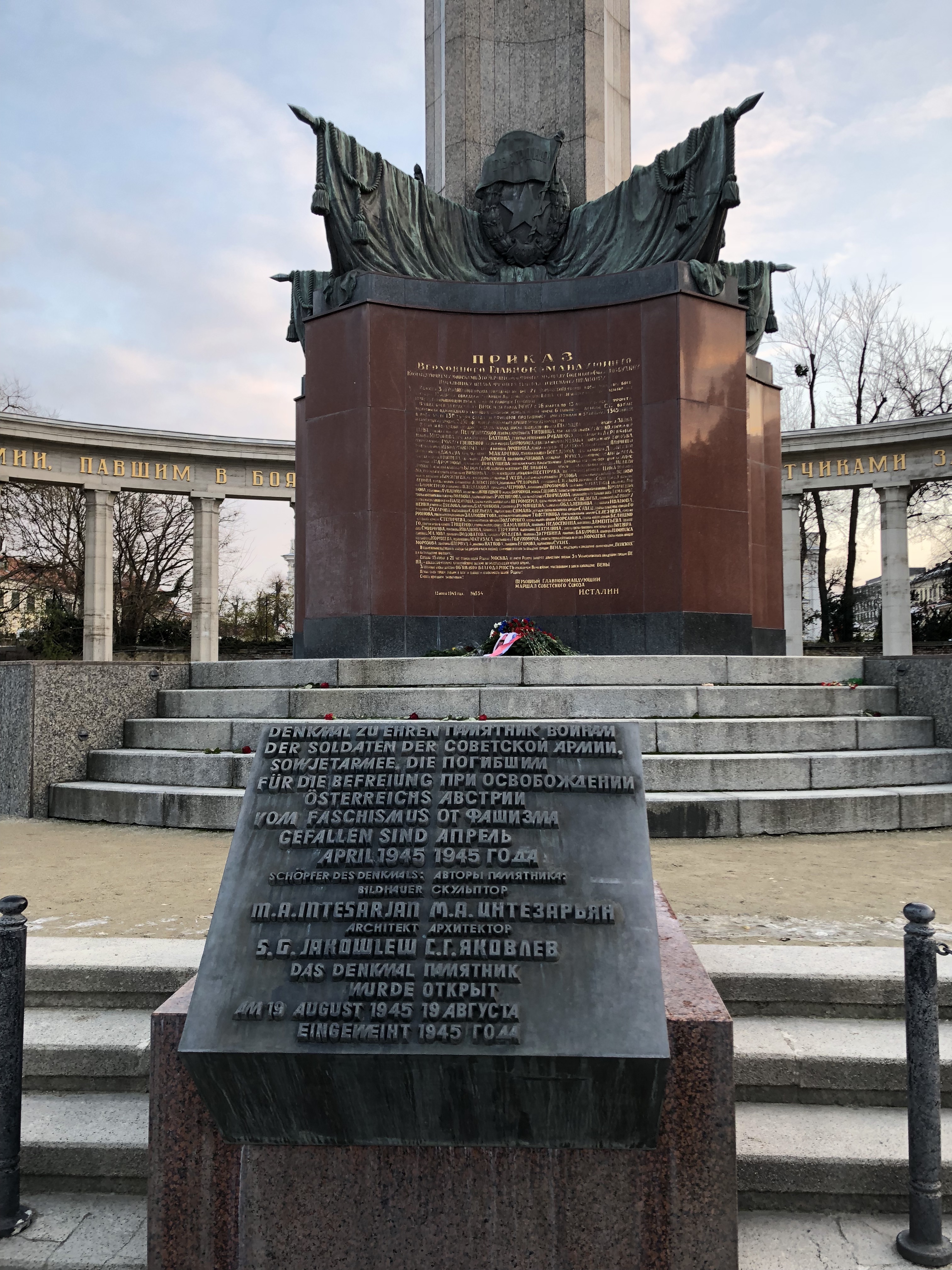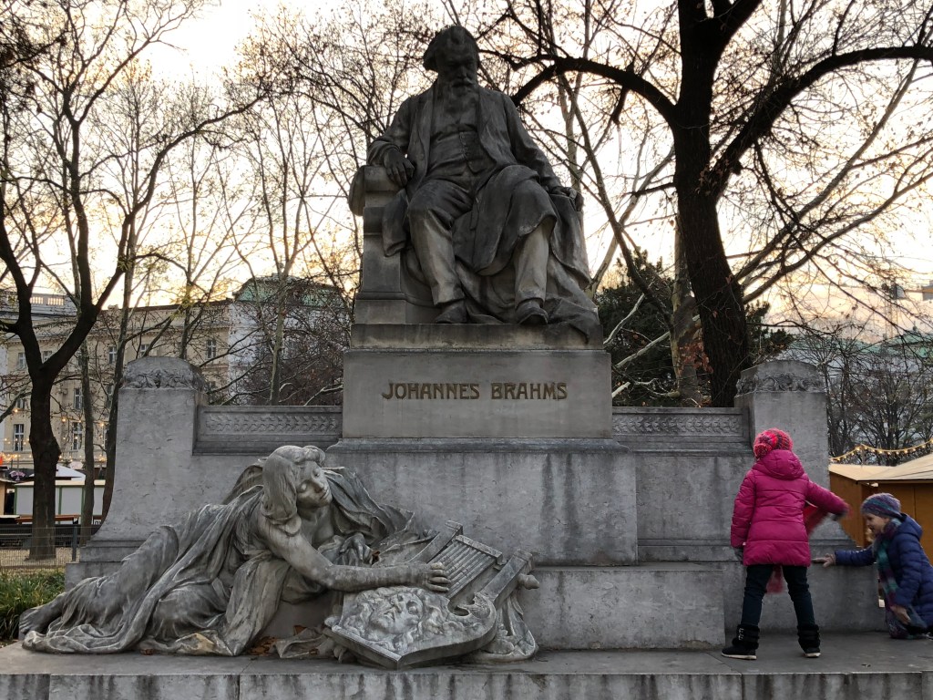 For lunch from 1-2 p.m., we stopped by a place called Cafe Landtmann, a place that was reportedly Sigmund Freud’s favorite place for a morning coffee. We actually ended up mostly getting sweets instead of a filling meal though, and I’ll cover that in another installment. They gave us the energy we needed to meander through the old town part of Vienna. Like most European old towns, this was a section of pedestrian-only streets surrounded by older architectured buildings. Though the rows of buildings were similar in height and grandeur to the ones in say, Paris, they also looked much newer. I’m not sure whether this is because most of the old town was destroyed by WWII bombing raids, or more recent renovations. First we passed by the Hapsburg palace, the imperial family’s usual residence. It was huge, but because it was integrated into the city it didn’t give the same imposing presence that the Schonnbrunn did. Also of note was the St. Stephens cathedral in the very heart of old town: Stephensplatz. The colorful tiling on the church’s roof is what makes it distinctive, countering our other friend’s claim that “once you’ve seen one church, you’ve seen ‘em all”. Since we weren’t able to enter the Schonnbrunn or Hapsburg palaces, we eventually headed instead to the Belvedere palace, on the eastern edge of the city center. Along the way, we passed a Brahms statue that was getting attention from some kids. Soon thereafter was a Soviet war memorial, which I didn’t expect to see because of how the Iron Curtain fell. It made more sense when I learned that the Soviets had in fact been the ones to drive the defending Axis army out of Vienna in April, 1945.